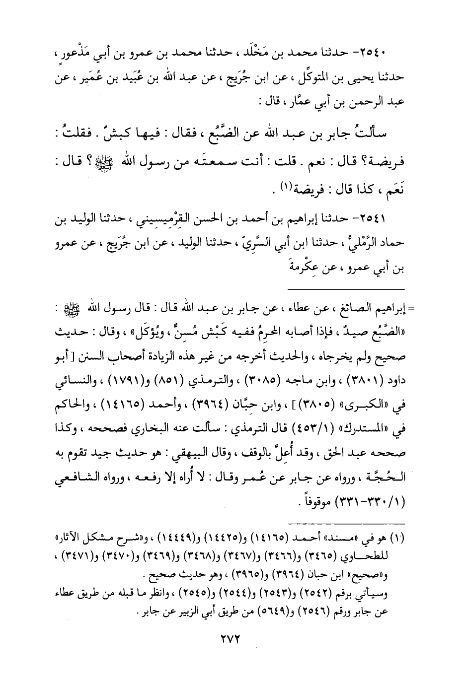 2540 - ثنا مُحَمَّدُ بْنُ مَخْلَدٍ , نا مُحَمَّدُ بْنُ عَمْرِو بْنِ أَبِي مَذْعُورٍ , ثنا يَحْيَى بْنُ الْمُتَوَكِّلِ , عَنِ ابْنِ جُرَيْجٍ , عَنْ عَبْدِ اللَّهِ بْنِ عُبَيْدِ بْنِ عُمَيْرٍ , عَنْ عَبْدِ الرَّحْمَنِ بْنِ أَبِي عَمَّارٍ , قَالَ: سَأَلْتُ جَابِرَ بْنَ عَبْدِ اللَّهِ عَنِ الضَّبُعِ , فَقَالَ: «§فِيهَا كَبْشٌ» , فَقُلْتُ: فَرِيضَةٌ؟ , فَقَالَ: «نَعَمْ» , قُلْتُ: أَنْتَ سَمِعْتَهُ مِنْ رَسُولِ اللَّهِ صَلَّى اللهُ عَلَيْهِ وَسَلَّمَ؟ , قَالَ: " نَعَمْ , كَذَا قَالَ: فَرِيضَةٌ "