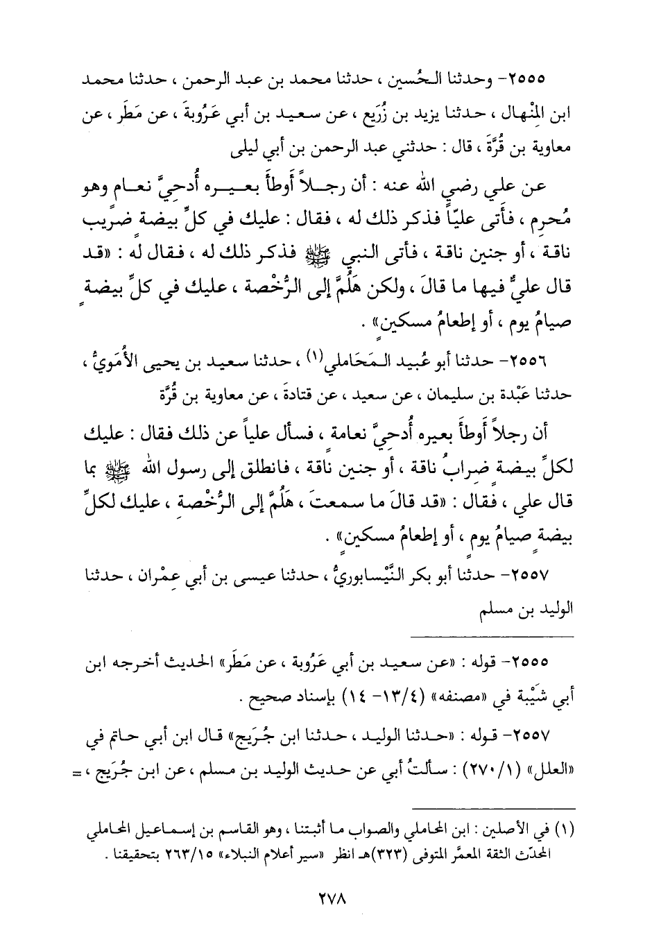 2555 - وَنا الْحُسَيْنُ بْنُ إِسْمَاعِيلَ , نا مُحَمَّدُ بْنُ عَبْدِ الرَّحْمَنِ , نا مُحَمَّدُ بْنُ مِنْهَالٍ , نا يَزِيدُ بْنُ زُرَيْعٍ , عَنْ سَعِيدِ بْنِ أَبِي عَرُوبَةَ , عَنْ مَطَرٍ , عَنْ مُعَاوِيَةَ بْنِ قُرَّةَ , حَدَّثَنِي عَبْدُ الرَّحْمَنِ بْنُ أَبِي لَيْلَى , عَنْ عَلِيٍّ رَضِيَ اللَّهُ عَنْهُ , أَنَّ رَجُلًا أَوْطَأَ بَعِيرُهُ أُدْحِيَّ نَعَامَةٍ وَهُوَ مُحْرِمٌ , فَأَتَى عَلِيًّا يَذْكُرُ ذَلِكَ لَهُ , فَقَالَ: عَلَيْكَ فِي كُلِّ بَيْضَةٍ ضَرَبْتَ نَاقَةٌ أَوْ جَنِينُ نَاقَةٍ , فَأَتَى النَّبِيَّ صَلَّى اللهُ عَلَيْهِ وَسَلَّمَ فَذَكَرَ لَهُ ذَلِكَ , فَقَالَ لَهُ: «قَدْ قَالَ عَلِيُّ فِيهَا مَا قَالَ وَلَكِنْ هَلُمَّ إِلَى الرُّخْصَةِ §عَلَيْكَ فِي كُلِّ بَيْضَةٍ صِيَامُ يَوْمٍ , أَوْ إِطْعَامُ مِسْكِينٍ»