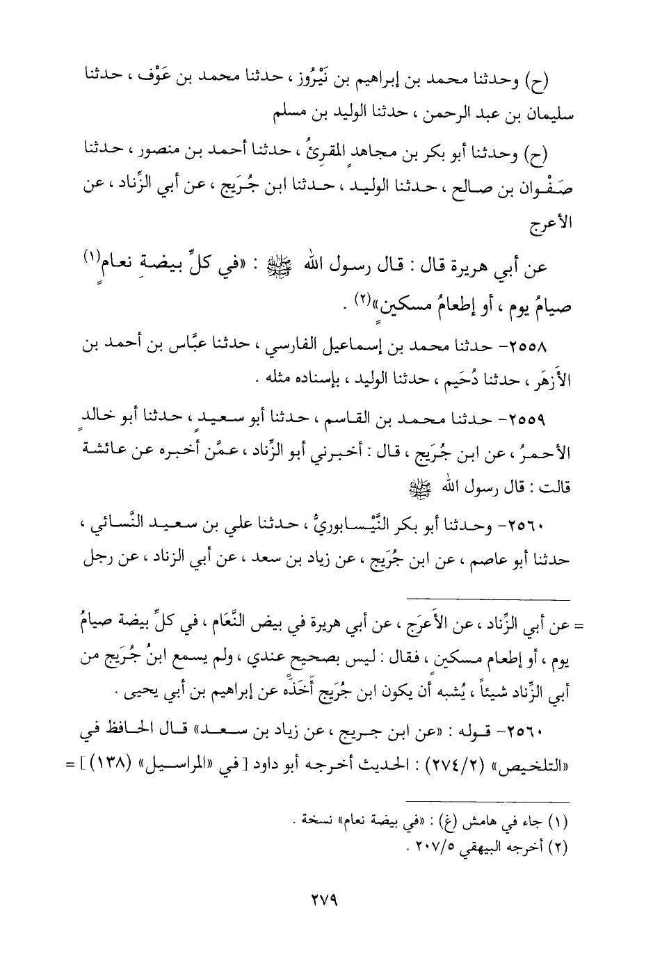 2560 - وَحَدَّثَنَا أَبُو بَكْرٍ النَّيْسَابُورِيُّ , نا عَلِيُّ بْنُ سَعِيدٍ النَّسَائِيُّ , نا أَبُو عَاصِمٍ , عَنِ ابْنِ جُرَيْجٍ , عَنْ زِيَادِ بْنِ سَعْدٍ , عَنْ أَبِي الزِّنَادِ , عَنْ رَجُلٍ , -[280]- عَنْ عَائِشَةَ رَضِيَ اللَّهُ عَنْهَا , أَنَّ رَسُولَ اللَّهِ صَلَّى اللهُ عَلَيْهِ وَسَلَّمَ قَالَ: § «فِي بَيْضَةِ نَعَامٍ كَسَرَهُ رَجُلٌ مُحْرِمٌ صِيَامُ يَوْمٍ فِي كُلِّ بَيْضَةٍ». قَالَ أَبُو خَالِدٍ: فِي بَيْضِ النَّعَامِ يُصِيبُهُ الْمُحْرِمُ صِيَامُ يَوْمٍ