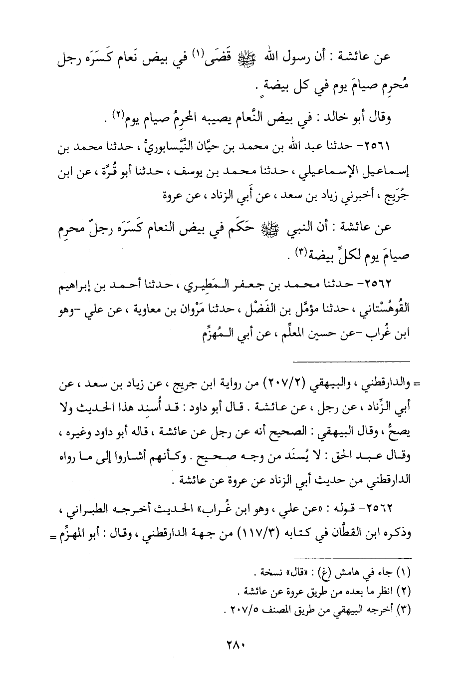 2561 - حَدَّثَنَا عَبْدُ اللَّهِ بْنُ مُحَمَّدِ بْنِ حَبَّانَ النَّيْسَابُورِيُّ , نا مُحَمَّدُ بْنُ إِسْمَاعِيلَ الْإِسْمَاعِيلِيُّ , نا مُحَمَّدُ بْنُ يُوسُفَ , نا أَبُو قُرَّةَ , عَنِ ابْنِ جُرَيْجٍ , أَخْبَرَنِي زِيَادُ بْنُ سَعْدٍ , عَنْ أَبِي الزِّنَادِ , عَنْ عُرْوَةَ , عَنْ عَائِشَةَ , عَنِ النَّبِيِّ صَلَّى اللهُ عَلَيْهِ وَسَلَّمَ «حَكَمَ §فِي بَيْضِ النَّعَامِ كَسَرَهُ رَجُلٌ مُحْرِمٌ صِيَامَ يَوْمٍ لِكُلِّ بَيْضَةٍ»