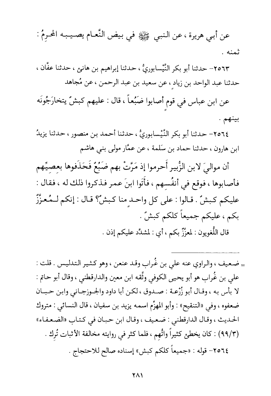 2564 - حَدَّثَنَا أَبُو بَكْرٍ النَّيْسَابُورِيُّ , نا أَحْمَدُ بْنُ مَنْصُورٍ , نا يَزِيدُ بْنُ هَارُونَ , نا حَمَّادُ بْنُ سَلَمَةَ , عَنْ عَمَّارٍ مَوْلَى بَنِي هَاشِمٍ , أَنَّ مَوَالِيَ لِابْنِ الزُّبَيْرِ أَحْرَمُوا إِذْ مَرَّتْ بِهِمْ ضَبُعٌ فَجَذَفُوهَا بِعِصِيِّهِمْ فَأَصَابُوهَا , فَوَقَعَ فِي أَنْفُسِهِمْ فَأَتَوْا ابْنَ عُمَرَ فَذَكَرُوا ذَلِكَ لَهُ , فَقَالَ: «عَلَيْكُمْ كَبْشٌ» , قَالُوا: عَلَى كُلِّ وَاحِدٍ مِنَّا كَبْشٌ؟ , قَالَ: § «إِنَّكُمْ لَمُغَزَّزٌ بِكُمْ عَلَيْكُمْ جَمِيعًا كُلُّكُمْ كَبْشٌ». قَالَ: اللُّغَوِيُّونَ: قَوْلُهُ: إِنَّكُمْ لَمُغَزَّزٌ بِكُمْ: أَيْ لَمُشَدَّدٌ عَلَيْكُمْ إِذًا