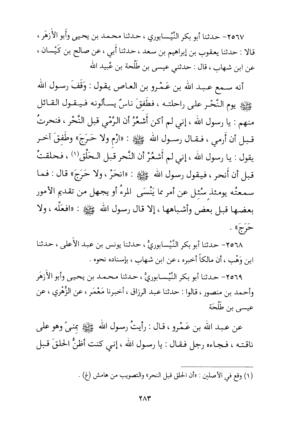 2569 - نا أَبُو بَكْرٍ النَّيْسَابُورِيُّ , نا مُحَمَّدُ بْنُ يَحْيَى , وَأَبُو الْأَزْهَرِ , وَأَحْمَدُ بْنُ مَنْصُورٍ , قَالُوا: نا عَبْدُ الرَّزَّاقِ , أنا مَعْمَرٌ , عَنِ الزُّهْرِيِّ , عَنْ عِيسَى بْنِ طَلْحَةَ , عَنْ عَبْدِ اللَّهِ بْنِ عَمْرٍو , قَالَ: رَأَيْتُ رَسُولَ اللَّهِ صَلَّى اللهُ عَلَيْهِ وَسَلَّمَ بِمِنًى وَهُوَ عَلَى نَاقَتِهِ فَجَاءَهُ رَجُلٌ , فَقَالَ: يَا رَسُولَ اللَّهِ إِنِّي كُنْتُ أَظُنُّ الْحَلْقَ قَبْلَ -[284]- النَّحْرِ فَحَلَقْتُ قَبْلَ أَنْ أَنْحَرَ , قَالَ: «§انْحَرْ وَلَا حَرَجَ» , قَالَ: وَجَاءَهُ آخَرُ فَقَالَ: يَا رَسُولَ اللَّهِ إِنِّي كُنْتُ أَظُنُّ الْحَلْقَ قَبْلَ الرَّمْيِ فَحَلَقْتُ قَبْلَ أَنْ أَرْمِيَ , قَالَ: «ارْمِ وَلَا حَرَجَ» , قَالَ: فَمَا سُئِلَ يَوْمَئِذٍ عَنْ شَيْءٍ قَدَمَّهُ رَجُلٌ وَلَا أَخَّرَهُ إِلَّا قَالَ: «افْعَلْ وَلَا حَرَجَ». كَذَا قَالَ عَبْدُ الرَّزَّاقِ , عَنْ مَعْمَرٍ: حَلَقْتُ قَبْلَ أَنْ أَرْمِيَ , وَتَابَعَهُ مُحَمَّدُ بْنُ أَبِي حَفْصَةَ فِي حَدِيثِهِ: أَفَضْتُ قَبْلَ أَنْ أَرْمِيَ وَلَمْ يُتَابَعْ عَلَيْهِ وَأَرَاهُ وَهَمَ فِيهِ وَاللَّهُ أَعْلَمُ