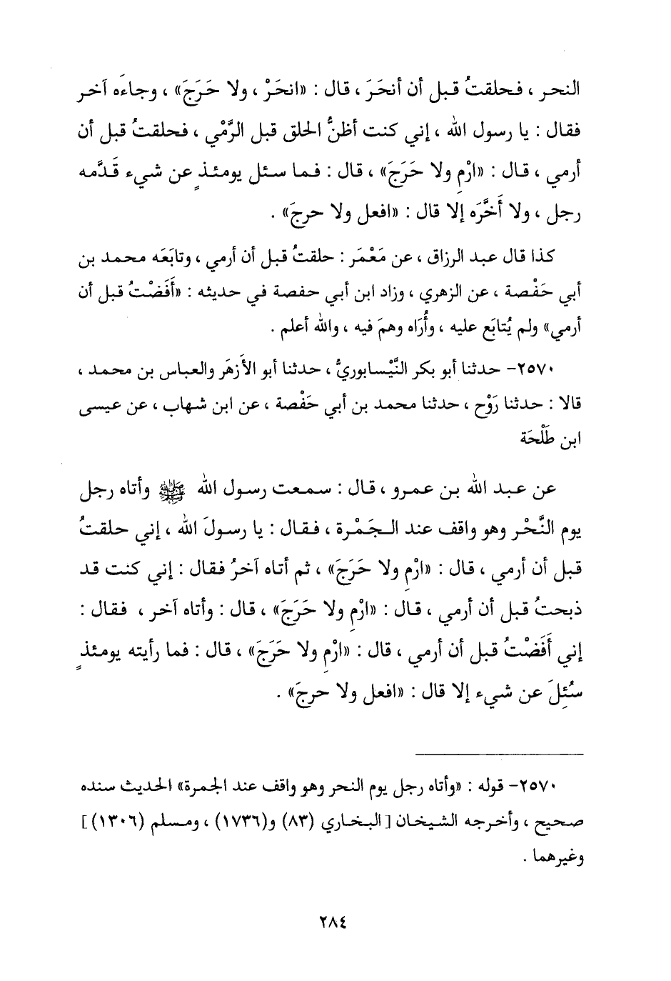 2570 - حَدَّثَنَا أَبُو بَكْرٍ النَّيْسَابُورِيُّ , ثنا أَبُو الْأَزْهَرِ , وَالْعَبَّاسُ بْنُ مُحَمَّدٍ , قَالَا: نا رَوْحٌ , نا مُحَمَّدُ بْنُ أَبِي حَفْصَةَ , عَنِ ابْنِ شِهَابٍ , عَنْ عِيسَى بْنِ طَلْحَةَ , عَنْ عَبْدِ اللَّهِ بْنِ عَمْرٍو , قَالَ: سَمِعْتُ رَسُولَ اللَّهِ صَلَّى اللهُ عَلَيْهِ وَسَلَّمَ , وَأَتَاهُ رَجُلٌ يَوْمَ النَّحْرِ وَهُوَ وَاقِفٌ عِنْدَ الْجَمْرَةِ , فَقَالَ: يَا رَسُولَ اللَّهِ إِنِّي حَلَقْتُ قَبْلَ أَنْ أَرْمِيَ , قَالَ: «§ارْمِ وَلَا حَرَجَ» , ثُمَّ أَتَاهُ آخَرُ فَقَالَ: إِنِّي كُنْتُ ذَبَحْتُ قَبْلَ أَنْ أَرْمِيَ , قَالَ: «ارْمِ وَلَا حَرَجَ» , قَالَ: وَأَتَاهُ آخَرُ فَقَالَ: إِنِّي أَفَضْتُ قَبْلَ أَنْ أَرْمِيَ , قَالَ: «ارْمِ وَلَا حَرَجَ» , قَالَ: فَمَا رَأَيْتُهُ يَوْمَئِذٍ سُئِلَ عَنْ شَيْءٍ إِلَّا قَالَ: «افْعَلْ وَلَا حَرَجَ»