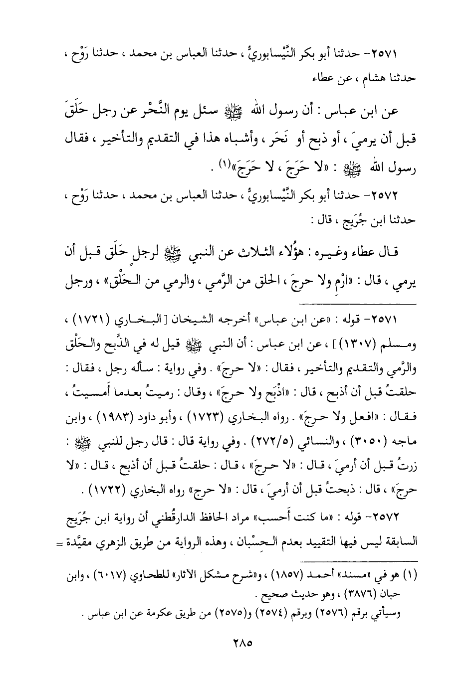 2571 - حَدَّثَنَا أَبُو بَكْرٍ النَّيْسَابُورِيُّ , نا الْعَبَّاسُ بْنُ مُحَمَّدٍ , نا رَوْحٌ , نا هِشَامٌ , عَنْ عَطَاءٍ , عَنِ ابْنِ عَبَّاسٍ , أَنَّ رَسُولَ اللَّهِ صَلَّى اللهُ عَلَيْهِ وَسَلَّمَ سُئِلَ يَوْمَ النَّحْرِ عَنْ رَجُلٍ حَلَقَ قَبْلَ أَنْ يَرْمِيَ أَوْ ذَبَحَ أَوْ نَحَرَ وَأَشْبَاهِ هَذَا فِي التَّقْدِيمِ وَالتَّأْخِيرِ , فَقَالَ رَسُولُ اللَّهِ صَلَّى اللهُ عَلَيْهِ وَسَلَّمَ: § «لَا حَرَجَ لَا حَرَجَ»