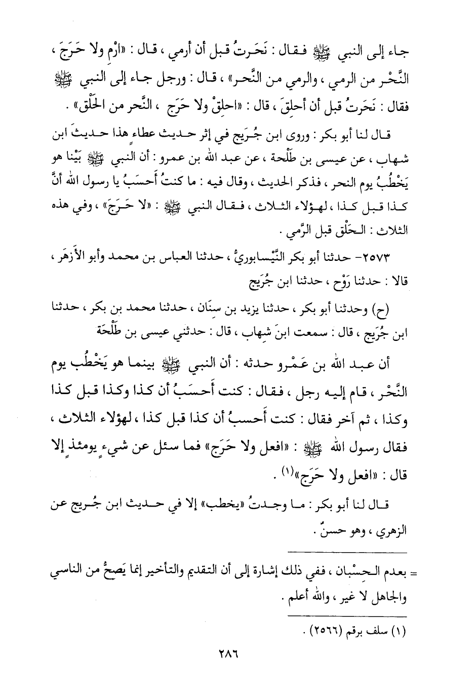 2573 - حَدَّثَنَا أَبُو بَكْرٍ النَّيْسَابُورِيُّ , ثنا الْعَبَّاسُ بْنُ مُحَمَّدٍ , وَأَبُو الْأَزْهَرِ , قَالَا: نا رَوْحٌ , نا ابْنُ جُرَيْجٍ , وَنا أَبُو بَكْرٍ النَّيْسَابُورِيُّ , نا يَزِيدُ بْنُ سِنَانٍ , نا مُحَمَّدُ بْنُ بَكْرٍ , نا ابْنُ جُرَيْجٍ , قَالَ: سَمِعْتُ ابْنَ شِهَابٍ , حَدَّثَنِي عِيسَى بْنُ طَلْحَةَ , أَنَّ عَبْدَ اللَّهِ بْنَ عَمْرٍو حَدَّثَهُ , أَنَّ النَّبِيَّ صَلَّى اللهُ عَلَيْهِ وَسَلَّمَ بَيْنَمَا هُوَ يَخْطُبُ يَوْمَ النَّحْرِ قَامَ إِلَيْهِ رَجُلٌ , قَالَ: كُنْتُ أَحْسَبُ أَنَّ كَذَا وَكَذَا قَبْلَ كَذَا وَكَذَا , ثُمَّ آخَرُ فَقَالَ: كُنْتُ أَحْسَبُ يَا رَسُولَ اللَّهِ أَنَّ كَذَا قَبْلَ كَذَا لِهَؤُلَاءِ الثَّلَاثِ , فَقَالَ رَسُولُ اللَّهِ صَلَّى اللهُ عَلَيْهِ وَسَلَّمَ: § «افْعَلْ وَلَا حَرَجَ» , فَمَا سُئِلَ يَوْمَئِذٍ عَنْ شَيْءٍ إِلَّا قَالَ: «افْعَلْ وَلَا حَرَجَ». قَالَ لَنَا أَبُو بَكْرٍ: مَا وَجَدْتُ: يَخْطُبُ إِلَّا فِي حَدِيثِ ابْنِ جُرَيْجٍ , عَنِ الزُّهْرِيِّ. وَهُوَ حَسَنٌ