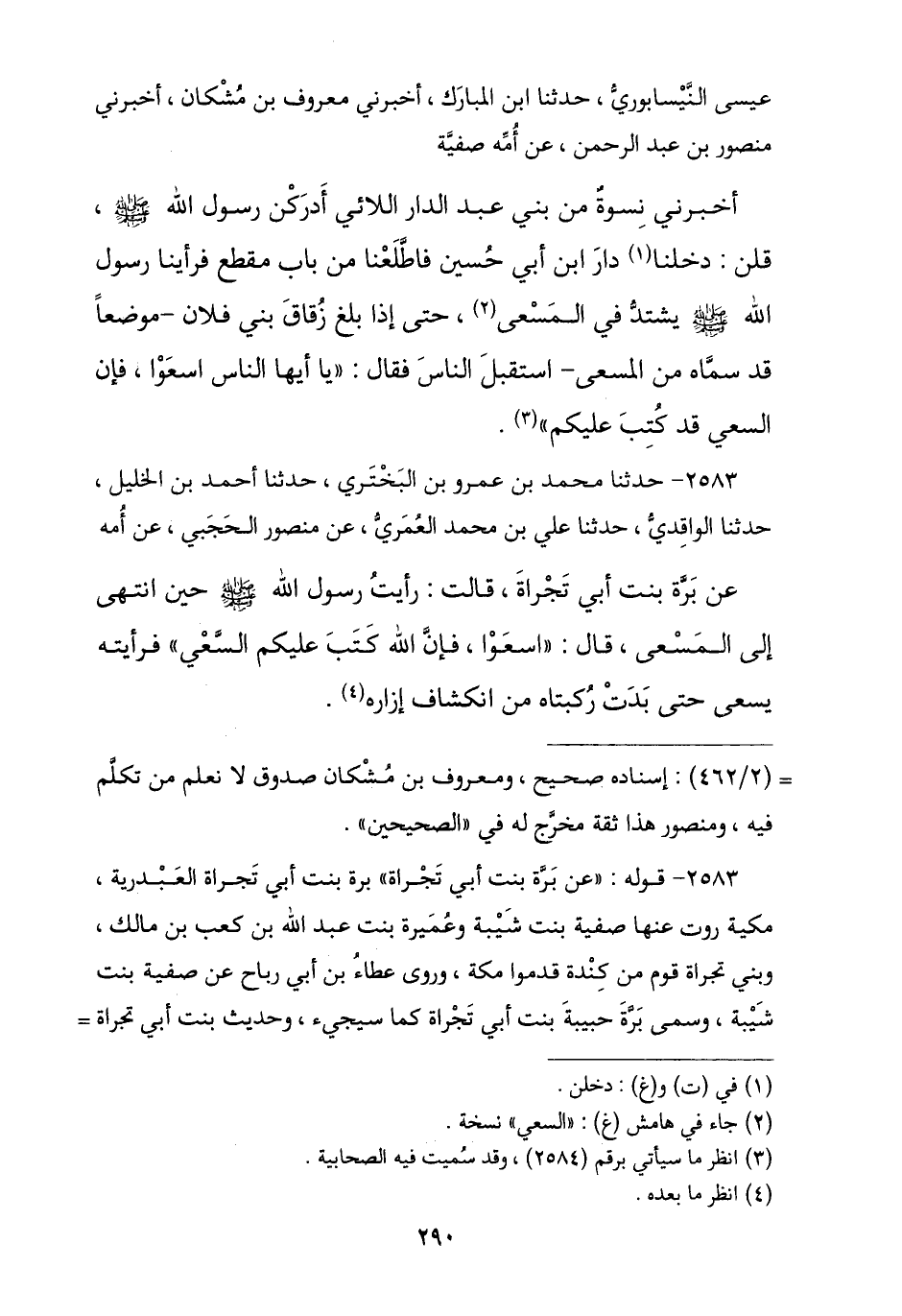 2583 - نا مُحَمَّدُ بْنُ عَمْرِو بْنِ الْبَخْتَرِيِّ , نا أَحْمَدُ بْنُ الْخَلِيلِ , نا الْوَاقِدِيُّ , نا عَلِيُّ بْنُ مُحَمَّدٍ الْعُمَرِيُّ , عَنْ مَنْصُورٍ الْحَجَبِيِّ , عَنْ أُمِّهِ , عَنْ بَرَّةَ بِنْتِ أَبِي تَجْرَاةَ , قَالَتْ: رَأَيْتُ رَسُولَ اللَّهِ صَلَّى اللهُ عَلَيْهِ وَسَلَّمَ حِينَ انْتَهَى إِلَى الْمَسْعَى , قَالَ: § «اسْعَوْا فَإِنَّ اللَّهَ كَتَبَ عَلَيْكُمُ السَّعْيَ». فَرَأَيْتُهُ يَسْعَى حَتَّى بَدَتْ رُكْبَتَاهُ مِنِ انْكِشَافِ إِزَارِهِ