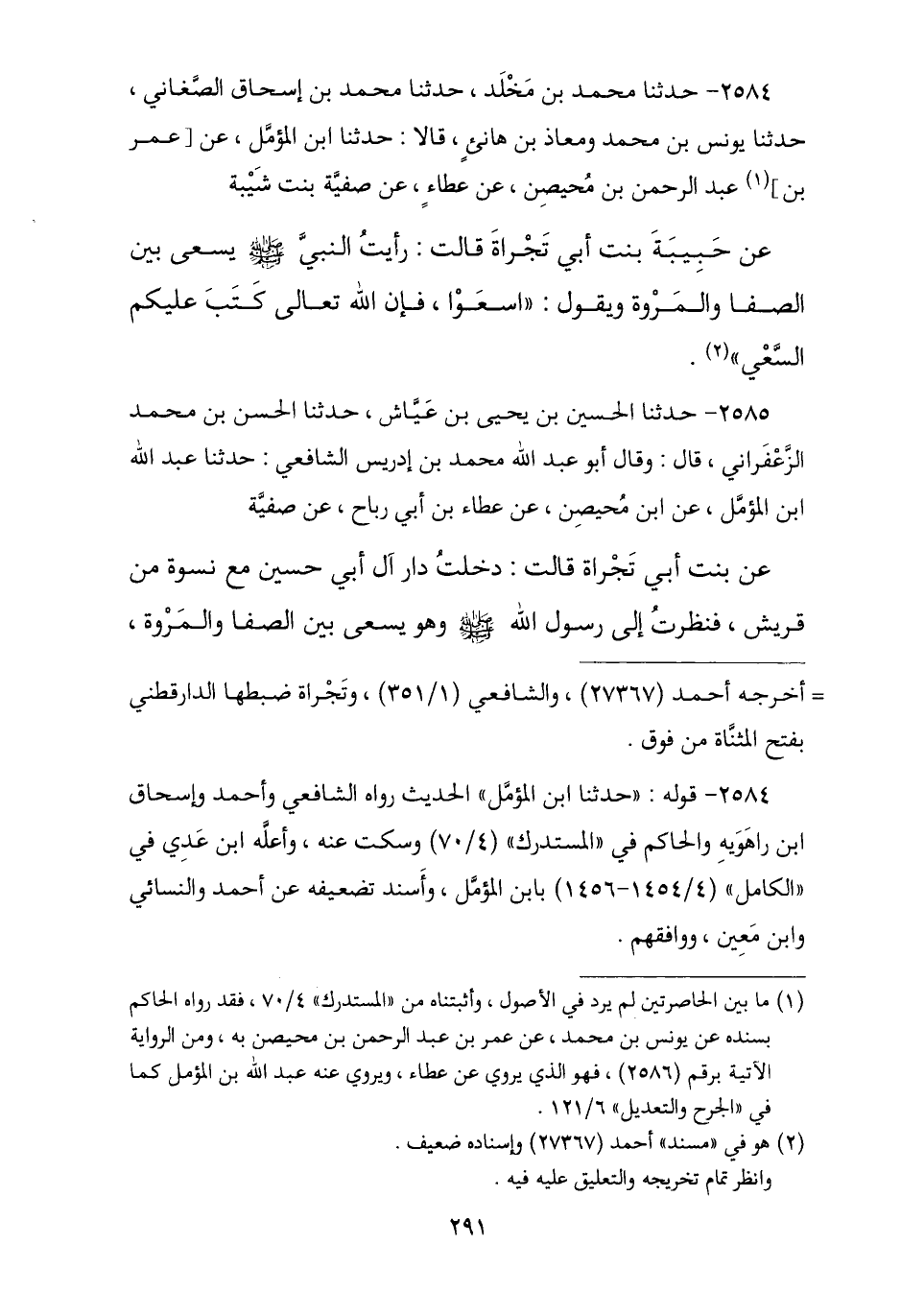 2584 - نا مُحَمَّدُ بْنُ مَخْلَدٍ , نا مُحَمَّدُ بْنُ إِسْحَاقَ الصَّغَانِيُّ , نا يُونُسُ بْنُ مُحَمَّدٍ , وَمُعَاذُ بْنُ هَانِئٍ , قَالَا: نا ابْنُ الْمُؤَمَّلِ , عَنْ عَبْدِ اللَّهِ بْنِ مُحَيْصِنٍ , عَنْ عَطَاءٍ , عَنْ صَفِيَّةَ بِنْتِ شَيْبَةَ , عَنْ حَبِيبَةَ بِنْتِ أَبِي تَجْرَاةَ , قَالَتْ: رَأَيْتُ النَّبِيَّ صَلَّى اللهُ عَلَيْهِ وَسَلَّمَ يَسْعَى بَيْنَ الصَّفَا وَالْمَرْوَةِ , وَيَقُولُ: § «اسْعَوْا فَإِنَّ اللَّهَ كَتَبَ عَلَيْكُمُ السَّعْيَ»