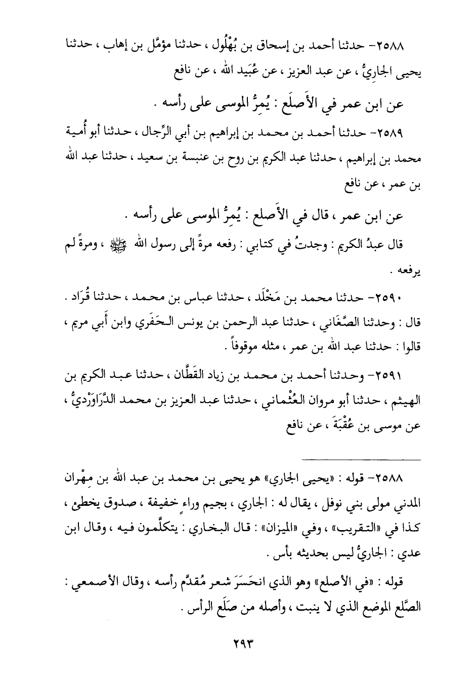 2588 - نا أَحْمَدُ بْنُ إِسْحَاقَ بْنِ بُهْلُولٍ , نا مُؤَمَّلُ بْنُ إِهَابٍ , نا يَحْيَى الْجَارِيُّ , عَنْ عَبْدِ الْعَزِيزِ , عَنْ عُبَيْدِ اللَّهِ , عَنْ نَافِعٍ , عَنِ ابْنِ عُمَرَ فِي الْأَصْلَعِ: § «يَمُرُّ الْمُوسَى عَلَى رَأْسِهِ»
