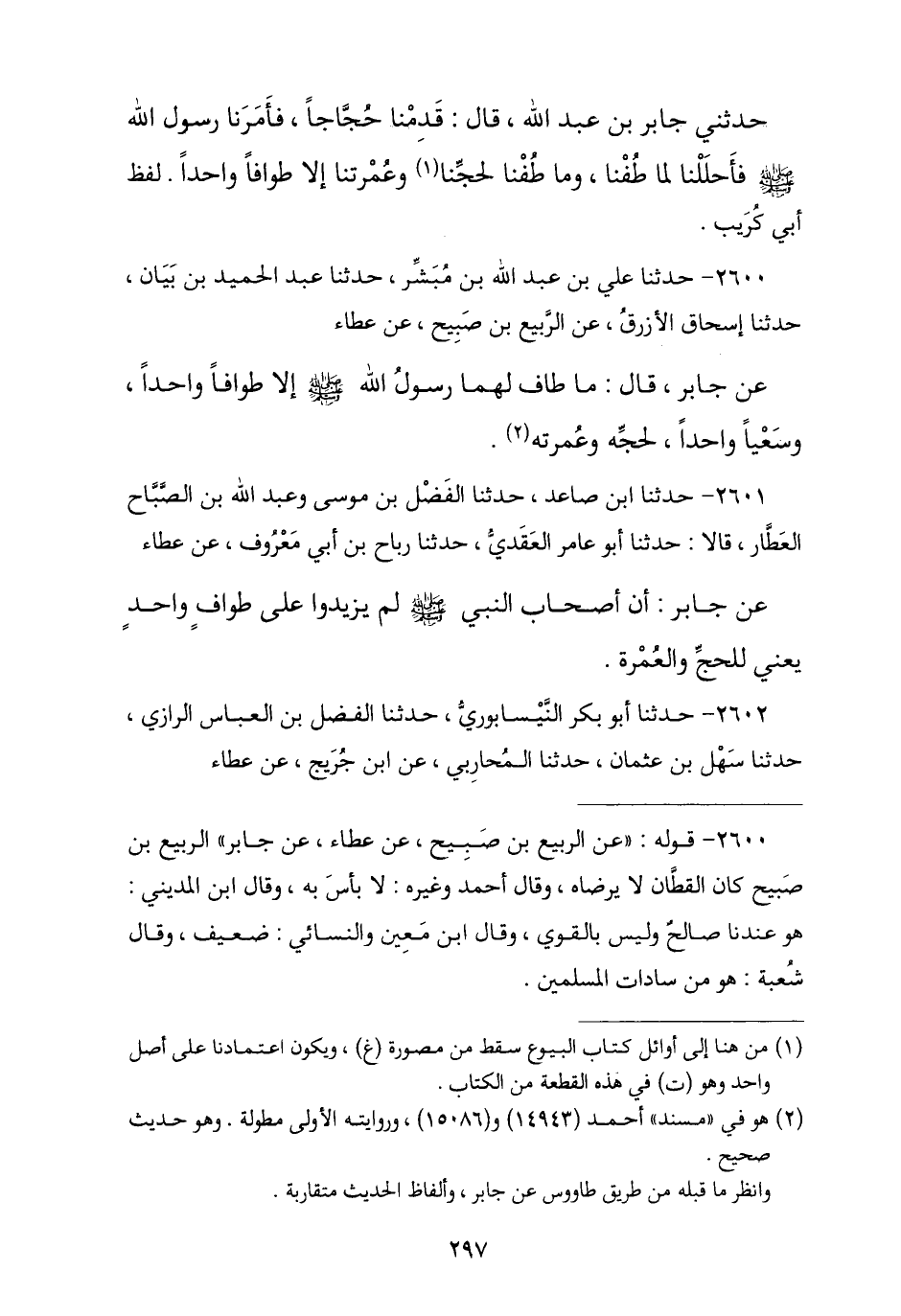 2601 - نا ابْنُ صَاعِدٍ , نا الْفَضْلُ بْنُ مُوسَى , وَعَبْدُ اللَّهِ بْنُ الصَّبَّاحِ الْعَطَّارُ , قَالَا: نا أَبُو عَامِرٍ الْعَقَدِيُّ , نا رَبَاحُ بْنُ أَبِي مَعْرُوفٍ , عَنْ عَطَاءٍ , عَنْ جَابِرٍ , «أَنَّ أَصْحَابَ النَّبِيِّ صَلَّى اللهُ عَلَيْهِ وَسَلَّمَ §لَمْ يَزِيدُوا عَلَى طَوَافٍ وَاحِدٍ يَعْنِي لِلْحَجِّ وَالْعُمْرَةِ»