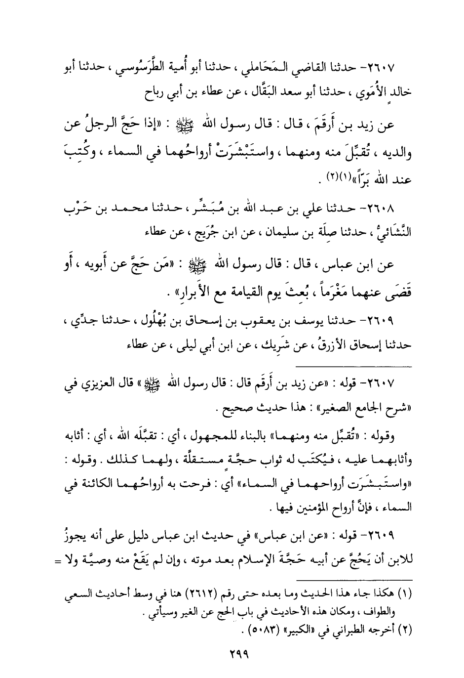 2607 - ثنا الْقَاضِي الْمَحَامِلِيُّ , ثنا أَبُو أُمَيَّةَ الطَّرَسُوسِيُّ , ثنا أَبُو خَالِدٍ الْأُمَوِيُّ , نا أَبُو سَعْدٍ الْبَقَّالُ , عَنْ عَطَاءِ بْنِ أَبِي رَبَاحٍ , عَنْ زَيْدِ بْنِ أَرْقَمَ , قَالَ: قَالَ رَسُولُ اللَّهِ صَلَّى اللهُ عَلَيْهِ وَسَلَّمَ: § «إِذَا حَجَّ الرَّجُلُ عَنْ وَالِدَيْهِ تُقُبِّلَ مِنْهُ وَمِنْهُمَا وَاسْتَبْشَرَتْ أَرْوَاحُهُمَا فِي السَّمَاءِ وَكُتِبَ عِنْدَ اللَّهِ تَعَالَى بَرًّا»