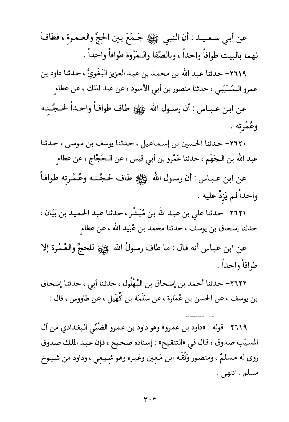 2619 - نا عَبْدُ اللَّهِ بْنُ مُحَمَّدِ بْنِ عَبْدِ الْعَزِيزِ الْبَغَوِيُّ , نا دَاوُدُ بْنُ عَمْرٍو الْمُسَيَّبِيُّ , نا مَنْصُورُ بْنُ أَبِي الْأَسْوَدِ , عَنْ عَبْدِ الْمَلِكِ , عَنْ عَطَاءٍ , عَنِ ابْنِ عَبَّاسٍ , أَنَّ رَسُولَ اللَّهِ صَلَّى اللهُ عَلَيْهِ وَسَلَّمَ § «طَافَ طَوَافًا وَاحِدًا لِحَجَّتِهِ وَعُمْرَتِهِ»