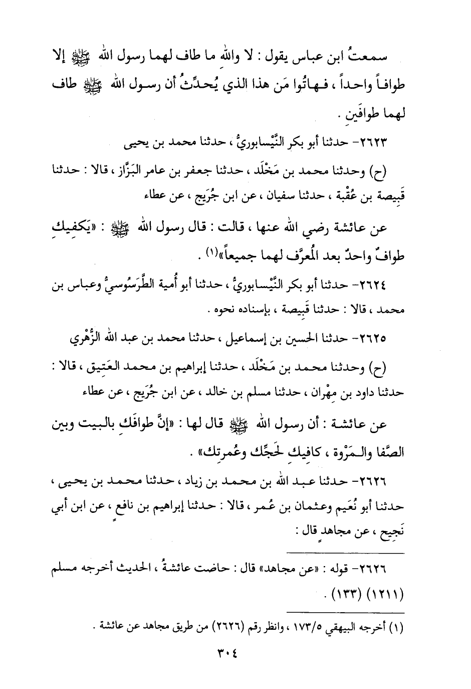 2625 - نا الْحُسَيْنُ بْنُ إِسْمَاعِيلَ , نا مُحَمَّدُ بْنُ عَبْدِ اللَّهِ الزُّهْرِيُّ , ح وَثنا مُحَمَّدُ بْنُ مَخْلَدٍ , نا إِبْرَاهِيمُ بْنُ مُحَمَّدٍ الْعَتِيقُ , قَالَا: نا دَاوُدُ بْنُ مِهْرَانَ , نا مُسْلِمُ بْنُ خَالِدٍ , عَنِ ابْنِ جُرَيْجٍ , عَنْ عَطَاءٍ , عَنْ عَائِشَةَ , أَنَّ رَسُولَ اللَّهِ صَلَّى اللهُ عَلَيْهِ وَسَلَّمَ قَالَ لَهَا: «إِنَّ §طَوَافَكِ بِالْبَيْتِ وَبَيْنَ الصَّفَا وَالْمَرْوَةِ كَافِيكَ بِحَجِّكِ وَعُمْرَتِكِ»