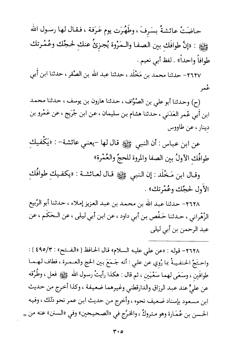 2627 - نا مُحَمَّدُ بْنُ مَخْلَدٍ , نا عَبْدُ اللَّهِ بْنُ الصَّقْرِ , نا ابْنُ أَبِي عُمَرَ , ح وَثنا أَبُو عَلِيِّ بْنُ الصَّوَّافِ , نا هَارُونُ بْنُ يُوسُفَ , نا مُحَمَّدُ بْنُ أَبِي عُمَرَ الْمُعَدَّلُ , نا هِشَامُ بْنُ سُلَيْمَانَ , عَنِ ابْنِ جُرَيْجٍ , عَنْ عَمْرِو بْنِ دِينَارٍ , عَنْ طَاوُسٍ , عَنِ ابْنِ عَبَّاسٍ , أَنَّ النَّبِيَّ صَلَّى اللهُ عَلَيْهِ وَسَلَّمَ قَالَ لِعَائِشَةَ: § «يَكْفِيكِ طَوَافُكِ الْأَوَّلُ بَيْنَ الصَّفَا وَالْمَرْوَةِ لِلْحَجِّ وَالْعُمْرَةِ». وَقَالَ ابْنُ مَخْلَدٍ: إِنَّ النَّبِيَّ صَلَّى اللهُ عَلَيْهِ وَسَلَّمَ قَالَ لِعَائِشَةَ: «يَكْفِيكِ طَوَافُكِ الْأَوَّلُ بِحَجَّتِكِ وَعُمْرَتِكِ»