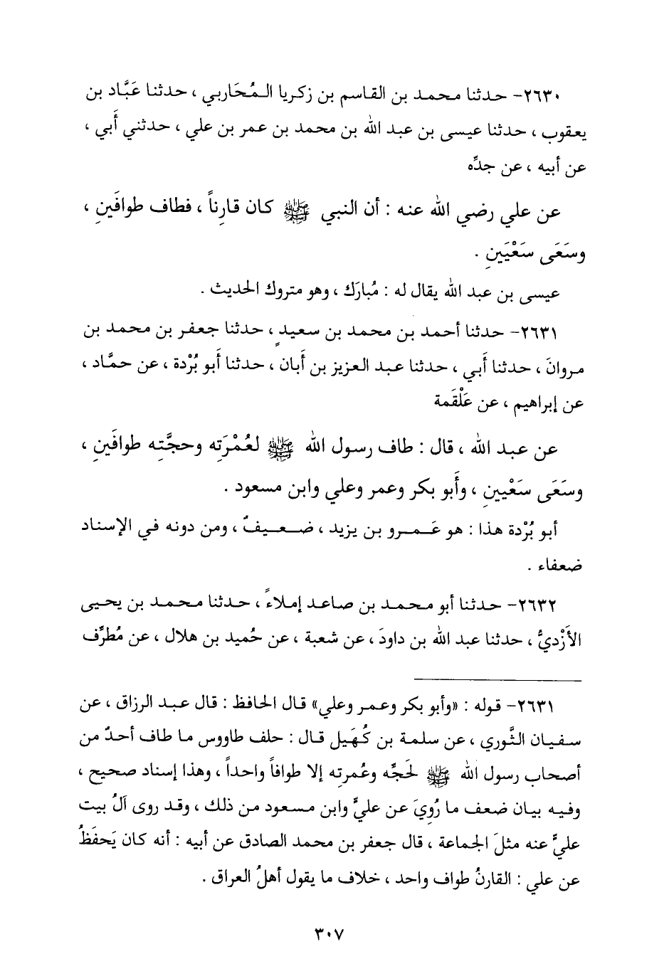 2630 - حَدَّثَنَا مُحَمَّدُ بْنُ الْقَاسِمِ بْنِ زَكَرِيَّا الْمُحَارِبِيُّ , نا عَبَّادُ بْنُ يَعْقُوبَ , نا عِيسَى بْنُ عَبْدِ اللَّهِ بْنِ مُحَمَّدِ بْنِ عُمَرَ بْنِ عَلِيٍّ , حَدَّثَنِي أَبِي , عَنْ أَبِيهِ , عَنْ جَدِّهِ , عَنْ عَلِيٍّ , أَنَّ النَّبِيَّ صَلَّى اللهُ عَلَيْهِ وَسَلَّمَ § «كَانَ قَارِنًا فَطَافَ طَوَافَيْنِ وَسَعَى سَعْيَيْنِ». عِيسَى بْنُ عَبْدِ اللَّهِ يُقَالُ لَهُ: مُبَارَكٌ وَهُوَ مَتْرُوكُ الْحَدِيثِ