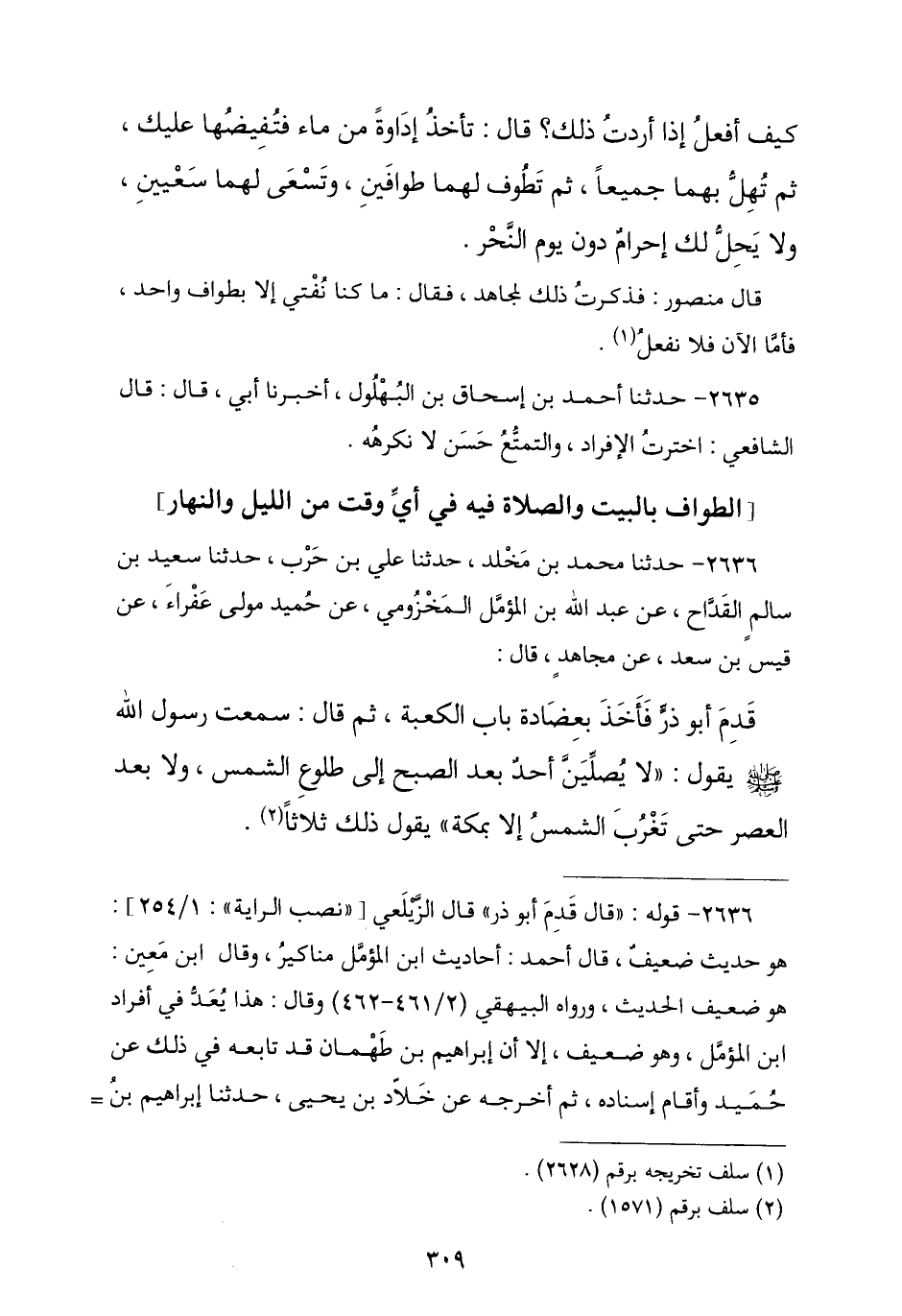 2636 - وَحَدَّثَنَا مُحَمَّدُ بْنُ مَخْلَدٍ , نا عَلِيُّ بْنُ حَرْبٍ , نا سَعِيدُ بْنُ سَالِمٍ الْقِدَاحُ , عَنْ عَبْدِ اللَّهِ بْنِ الْمُؤَمَّلِ الْمَخْزُومِيِّ , عَنْ حُمَيْدٍ مَوْلَى عَفْرَاءَ , عَنْ قَيْسِ بْنِ سَعْدٍ , عَنْ مُجَاهِدٍ , قَالَ: قَدِمَ أَبُو ذَرٍّ فَأَخَذَ بِعِضَادَةِ بَابِ الْكَعْبَةِ , ثُمَّ قَالَ: سَمِعْتُ رَسُولَ اللَّهِ صَلَّى اللهُ عَلَيْهِ وَسَلَّمَ , يَقُولُ: § «لَا يُصَلِّيَنَّ أَحَدٌ بَعْدَ الصُّبْحِ إِلَى طُلُوعِ الشَّمْسِ , وَلَا بَعْدَ الْعَصْرِ حَتَّى تَغْرُبَ الشَّمْسُ إِلَّا بِمَكَّةَ» , يَقُولُ ذَلِكَ ثَلَاثًا