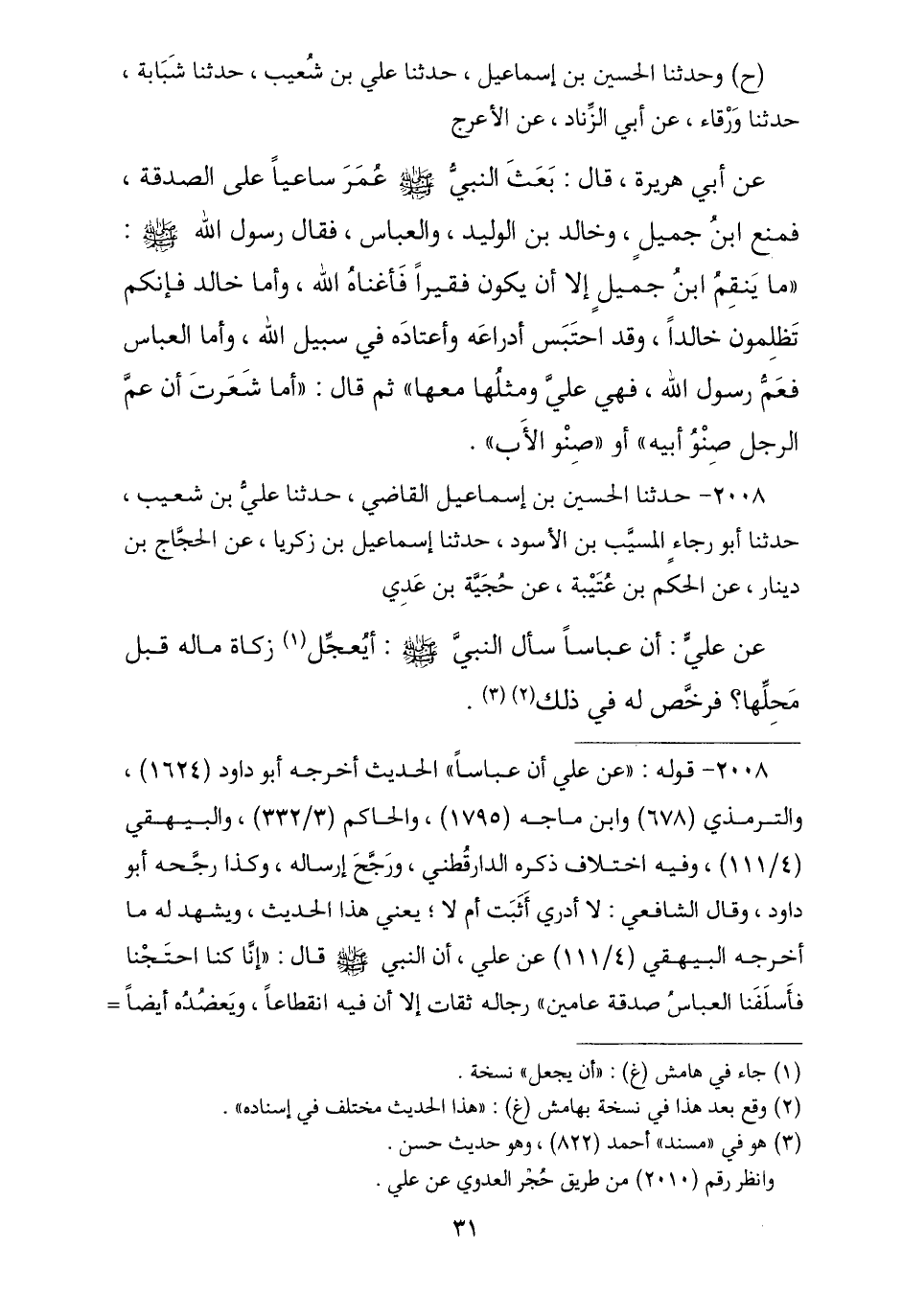 2008 - حَدَّثَنَا الْحُسَيْنُ بْنُ إِسْمَاعِيلَ , ثنا عَلِيُّ بْنُ شُعَيْبٍ , ثنا أَبُو رَجَاءٍ الْمُسَيَّبُ بْنُ الْأَسْوَدِ , ثنا إِسْمَاعِيلُ بْنُ زَكَرِيَّا , عَنِ الْحَجَّاجِ بْنِ دِينَارٍ , عَنِ الْحَكَمِ بْنِ عُتَيْبَةَ , عَنْ حُجَيَّةَ بْنِ عَدِيٍّ , عَنْ عَلِيٍّ , أَنَّ عَبَّاسًا «سَأَلَ النَّبِيَّ صَلَّى اللهُ عَلَيْهِ وَسَلَّمَ أَنْ §يُعَجِّلَ زَكَاةَ مَالِهِ قَبْلَ مَحِلِّهَا فَرَخَّصَ لَهُ فِي ذَلِكَ»