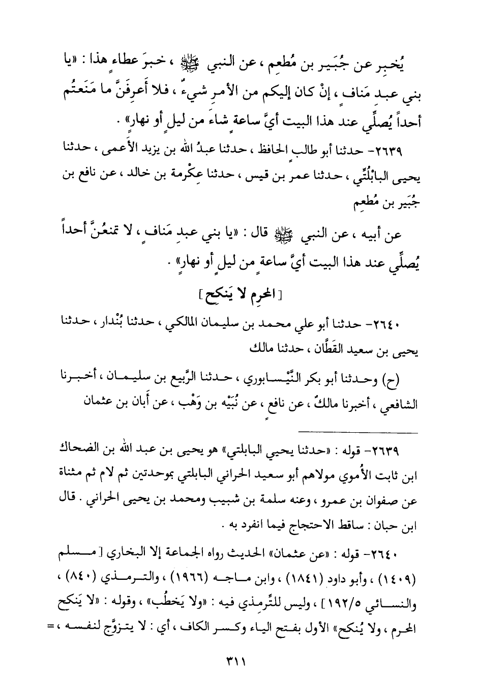 2639 - نا أَبُو طَالِبٍ الْحَافِظُ , نا عَبْدُ اللَّهِ بْنُ يَزِيدَ الْأَعْمَى , نا يَحْيَى الْبَابُلْتِيُّ , نا عُمَرُ بْنُ قَيْسٍ , نا عِكْرِمَةُ بْنُ خَالِدٍ , عَنْ نَافِعِ بْنِ جُبَيْرِ بْنِ مُطْعِمٍ , عَنْ أَبِيهِ , عَنِ النَّبِيِّ صَلَّى اللهُ عَلَيْهِ وَسَلَّمَ , قَالَ: «يَا بَنِي عَبْدِ مَنَافٍ §لَا تَمْنَعُنَّ أَحَدًا يُصَلِّي عِنْدَ هَذَا الْبَيْتِ أَيَّ سَاعَةٍ مِنْ لَيْلٍ أَوْ نَهَارٍ»