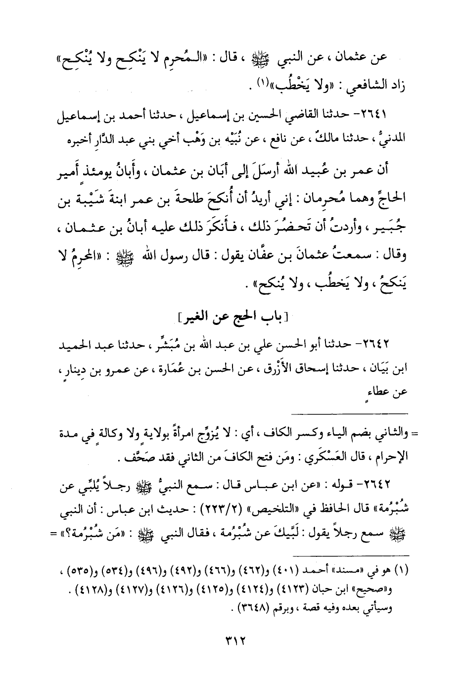 2641 - نا الْقَاضِي الْحُسَيْنُ بْنُ إِسْمَاعِيلَ , نا أَحْمَدُ بْنُ إِسْمَاعِيلَ الْمَدَنِيُّ , نا مَالِكٌ , عَنْ نَافِعٍ , عَنْ نُبَيْهِ بْنِ وَهْبٍ أَخِي بَنِي عَبْدِ الدَّارِ أَخْبَرَ , أَنَّ عُمَرَ بْنَ عُبَيْدِ اللَّهِ أَرْسَلَ إِلَى أَبَانَ بْنِ عُثْمَانَ , وَأَبَانُ يَوْمَئِذٍ أَمِيرُ الْحَاجِّ وَهُمَا مُحْرِمَانِ إِنِّي أُرِيدُ أَنْ أُنْكِحَ طَلْحَةَ بْنَ عُمَرَ ابْنَةَ شَيْبَةَ بْنِ جُبَيْرٍ وَأَرَدْتُ أَنْ تَحْضُرَ ذَلِكَ , فَأَنْكَرَ ذَلِكَ عَلَيْهِ أَبَانُ بْنُ عُثْمَانَ وَقَالَ: سَمِعْتُ عُثْمَانَ بْنَ عَفَّانَ , يَقُولُ: قَالَ رَسُولُ اللَّهِ صَلَّى اللهُ عَلَيْهِ وَسَلَّمَ: § «الْمُحْرِمُ لَا يَنْكِحُ وَلَا يَخْطُبُ وَلَا يُنْكِحُ»