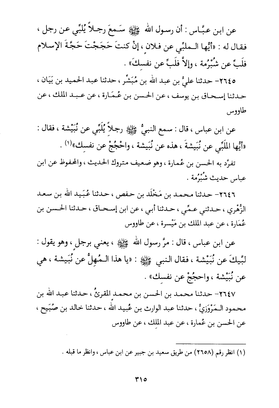 2646 - نا مُحَمَّدُ بْنُ مَخْلَدِ بْنِ حَفْصٍ , نا عُبَيْدُ اللَّهِ بْنُ سَعْدٍ الزُّهْرِيُّ , حَدَّثَنِي عَمِّي , نا أَبِي , عَنِ ابْنِ إِسْحَاقَ , نا الْحَسَنُ بْنُ عُمَارَةَ , عَنْ عَبْدِ الْمَلِكِ بْنِ مَيْسَرَةَ , عَنْ طَاوُسٍ , عَنِ ابْنِ عَبَّاسٍ , قَالَ: مَرَّ النَّبِيُّ صَلَّى اللهُ عَلَيْهِ وَسَلَّمَ يَعْنِي بِرَجُلٍ وَهُوَ يَقُولُ: لَبَّيْكَ عَنْ نُبَيْشَةَ , فَقَالَ النَّبِيُّ صَلَّى اللهُ عَلَيْهِ وَسَلَّمَ: «يَا هَذَا الْمُهِلُّ عَنْ نُبَيْشَةَ، هِيَ عَنْ نُبَيْشَةَ §وَاحْجُجْ عَنْ نَفْسِكَ»