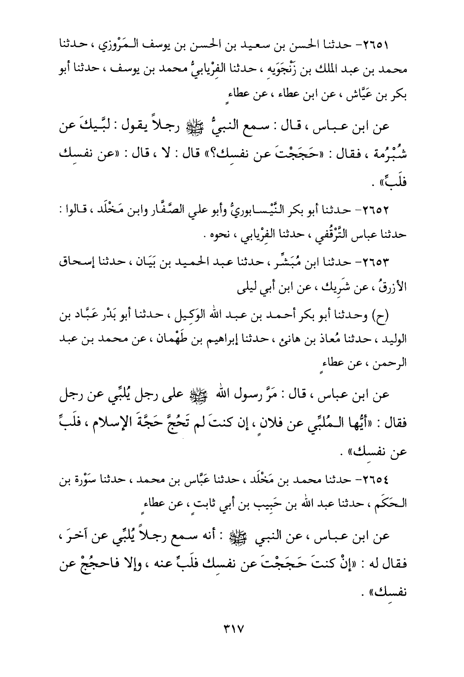 2651 - نا الْحَسَنُ بْنُ سَعِيدِ بْنِ الْحَسَنِ بْنِ يُوسُفَ الْمَرْوَزِيُّ , نا مُحَمَّدُ بْنُ عَبْدِ الْمَلِكِ بْنِ زَنْجُوَيْهِ , نا الْفِرْيَابِيُّ مُحَمَّدُ بْنُ يُوسُفَ , نا أَبُو بَكْرِ بْنُ عَيَّاشٍ , عَنِ ابْنِ عَطَاءٍ , عَنْ عَطَاءٍ , عَنِ ابْنِ عَبَّاسٍ , قَالَ: سَمِعَ النَّبِيُّ صَلَّى اللهُ عَلَيْهِ وَسَلَّمَ رَجُلًا يَقُولُ: لَبَّيْكَ عَنْ شُبْرُمَةَ فَقَالَ: «§حَجَجْتَ عَنْ نَفْسِكَ؟» قَالَ: لَا قَالَ: «عَنْ نَفْسِكَ فَلَبِّ».