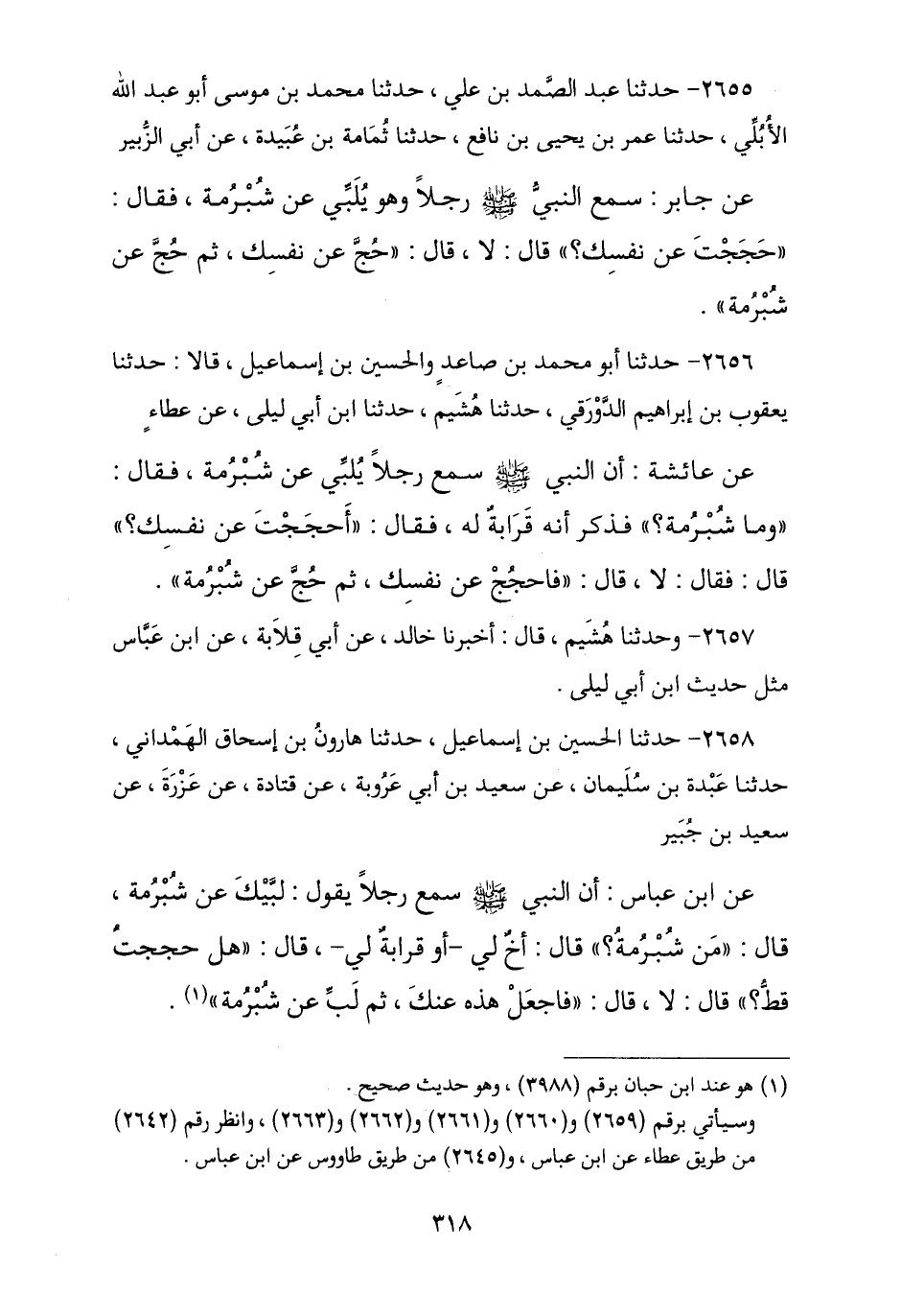 2658 - نا الْحُسَيْنُ بْنُ إِسْمَاعِيلَ , نا هَارُونُ بْنُ إِسْحَاقَ الْهَمْدَانِيُّ , نا عَبْدَةُ بْنُ سُلَيْمَانَ , عَنْ سَعِيدِ بْنِ أَبِي عَرُوبَةَ , عَنْ عَزْرَةَ , عَنْ سَعِيدِ بْنِ جُبَيْرٍ , عَنِ ابْنِ عَبَّاسٍ , أَنَّ النَّبِيَّ صَلَّى اللهُ عَلَيْهِ وَسَلَّمَ سَمِعَ رَجُلًا , يَقُولُ: لَبَّيْكَ عَنْ شُبْرُمَةَ , قَالَ: «مَنْ شُبْرُمَةَ؟» , قَالَ: أَخٌ لِي أَوْ قَرَابَةٌ لِي , قَالَ: «§هَلْ حَجَجْتَ قَطُّ؟» , قَالَ: لَا , قَالَ: «فَاجْعَلْ هَذِهِ عَنْكَ ثُمَّ لَبِّ عَنْ شُبْرُمَةَ». -[319]-