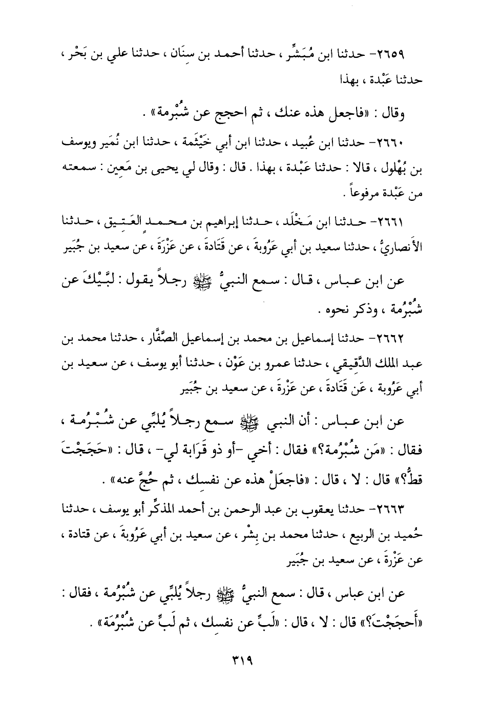 2663 - ثنا يَعْقُوبُ بْنُ عَبْدِ الرَّحْمَنِ بْنِ أَحْمَدَ الْمُذَكِّرُ أَبُو يُوسُفَ , نا حُمَيْدُ بْنُ الرَّبِيعِ , نا مُحَمَّدُ بْنُ بِشْرٍ , عَنْ سَعِيدِ بْنِ أَبِي عَرُوبَةَ , عَنْ قَتَادَةَ , عَنْ عَزْرَةَ , عَنْ سَعِيدِ بْنِ جُبَيْرٍ , عَنِ ابْنِ عَبَّاسٍ , قَالَ: سَمِعَ النَّبِيُّ صَلَّى اللهُ عَلَيْهِ وَسَلَّمَ رَجُلًا يُلَبِّي عَنْ شُبْرُمَةَ , فَقَالَ: «أَحَجَجْتَ؟» , قَالَ: لَا , قَالَ: «§لَبِّ عَنْ نَفْسِكَ ثُمَّ لَبِّ عَنْ شُبْرُمَةَ». -[320]-