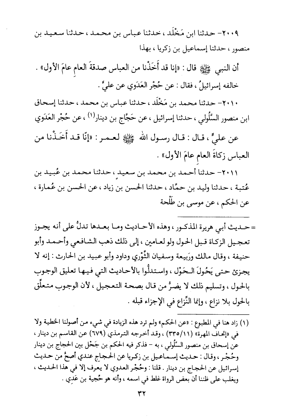 2009 - حَدَّثَنَا ابْنُ مَخْلَدٍ , ثنا عَبَّاسُ بْنُ مُحَمَّدٍ , ثنا سَعِيدُ بْنُ مَنْصُورٍ , ثنا إِسْمَاعِيلُ بْنُ زَكَرِيَّا بِهَذَا , أَنَّ النَّبِيَّ صَلَّى اللهُ عَلَيْهِ وَسَلَّمَ , قَالَ: «إِنَّا §قَدْ أَخَذْنَا مِنَ الْعَبَّاسِ صَدَقَةَ الْعَامِ الْأَوَّلِ». خَالَفَهُ إِسْرَائِيلُ , فَقَالَ: عَنْ حُجْرٍ الْعَدَوِيِّ , عَنْ عَلِيٍّ
