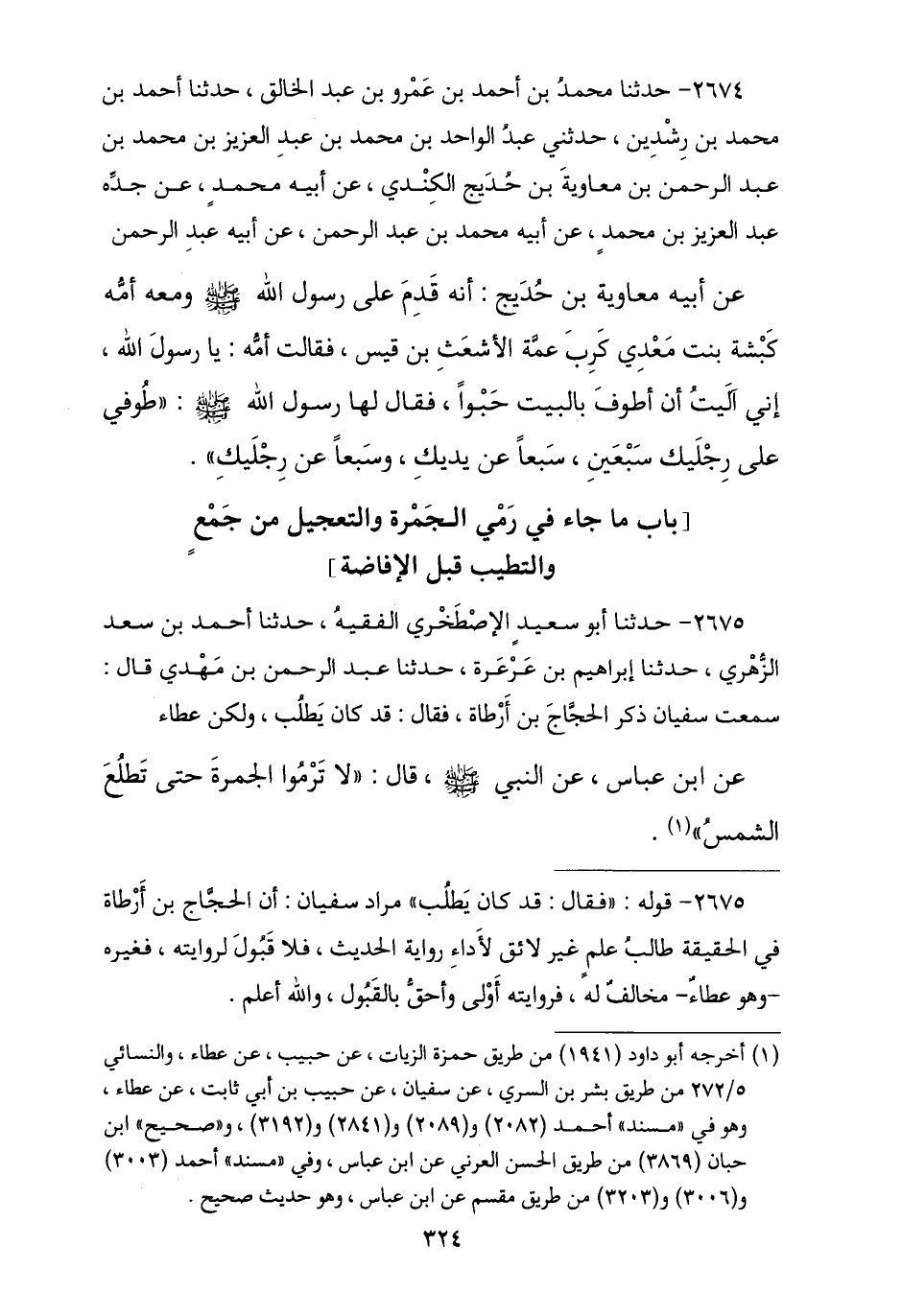2675 - ثنا أَبُو سَعِيدٍ الْإِصْطَخْرِيُّ الْفَقِيهُ , نا أَحْمَدُ بْنُ سَعْدٍ الزُّهْرِيُّ , نا إِبْرَاهِيمُ بْنُ عَرْعَرَةَ , نا عَبْدُ الرَّحْمَنِ بْنُ مَهْدِيٍّ , قَالَ: سَمِعْتُ سُفْيَانَ ذَكَرَ الْحَجَّاجَ بْنَ أَرْطَأَةَ , فَقَالَ: قَدْ كَانَ يُطْلَبُ وَلَكِنْ عَطَاءٌ , عَنِ ابْنِ عَبَّاسٍ , عَنِ النَّبِيِّ صَلَّى اللهُ عَلَيْهِ وَسَلَّمَ , قَالَ: § «لَا تَرْمُوا الْجَمْرَةَ حَتَّى تَطْلُعَ الشَّمْسُ»