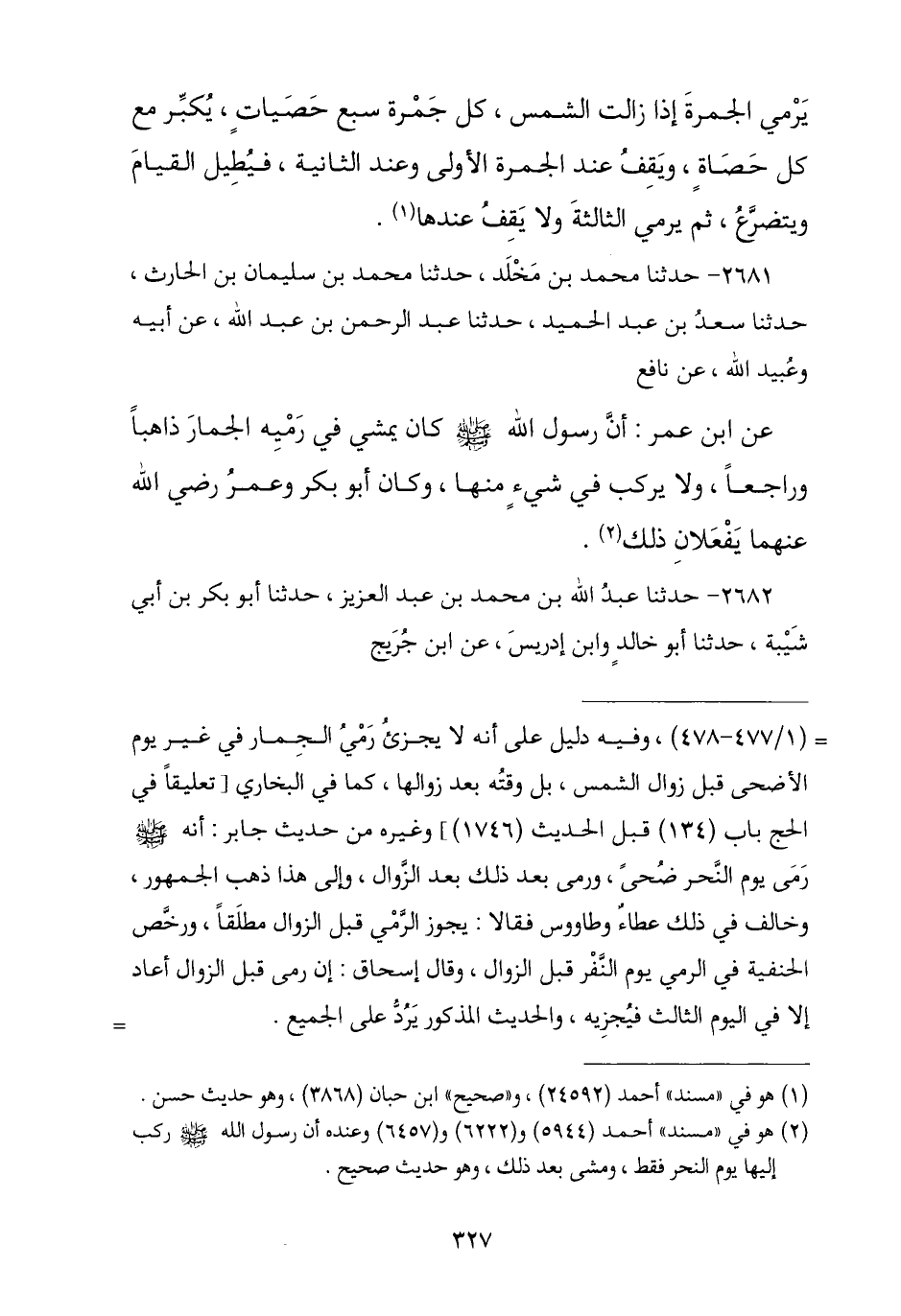 2682 - ثنا عَبْدُ اللَّهِ بْنُ مُحَمَّدِ بْنِ عَبْدِ الْعَزِيزِ , نا أَبُو بَكْرِ بْنُ أَبِي شَيْبَةَ , نا أَبُو خَالِدٍ الْأَحْمَرُ , وَابْنُ إِدْرِيسَ , عَنِ ابْنِ جُرَيْجٍ , -[328]- ح وَثنا الْحُسَيْنُ بْنُ إِسْمَاعِيلَ , نا عَلِيُّ بْنُ شُعَيْبٍ , نا عَبْدُ الْمَجِيدِ بْنُ عَبْدِ الْعَزِيزِ بْنِ أَبِي رَوَّادٍ , عَنِ ابْنِ جُرَيْجٍ , عَنْ أَبِي الزُّبَيْرِ , قَالَ: سَمِعْتُ جَابِرَ بْنَ عَبْدِ اللَّهِ , يَقُولُ: رَأَيْتُ النَّبِيَّ صَلَّى اللهُ عَلَيْهِ وَسَلَّمَ § «رَمَى الْجَمْرَةَ يَوْمَ النَّحْرِ ضُحًى فَأَمَّا بَعْدَ ذَلِكَ فَعِنْدَ زَوَالِ الشَّمْسِ». وَقَالَ ابْنُ أَبِي شَيْبَةَ: «رَمَى جَمْرَةِ الْعَقَبَةِ , يَوْمَ النَّحْرِ ضُحًى فَأَمَّا بَعْدَهُ فَإِذَا زَالَتِ الشَّمْسُ».
