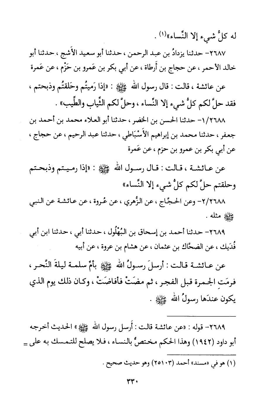 2687 - حَدَّثَنَا يَزْدَادُ بْنُ عَبْدِ الرَّحْمَنِ , نا أَبُو سَعِيدٍ الْأَشَجُّ , نا أَبُو خَالِدٍ الْأَحْمَرُ , عَنْ حَجَّاجِ بْنِ أَرْطَأَةَ , عَنْ أَبِي بَكْرِ بْنِ عَمْرِو بْنِ حَزْمٍ , عَنْ عَمْرَةَ , عَنْ عَائِشَةَ , قَالَتْ: قَالَ رَسُولُ اللَّهِ صَلَّى اللهُ عَلَيْهِ وَسَلَّمَ: § «إِذَا رَمَيْتُمْ وَحَلَقْتُمْ وَذَبَحْتُمْ فَقَدْ حَلَّ لَكُمْ كُلُّ شَيْءٍ إِلَّا النِّسَاءُ وَحَلَّ لَكُمُ الثِّيَابُ وَالطِّيبُ»