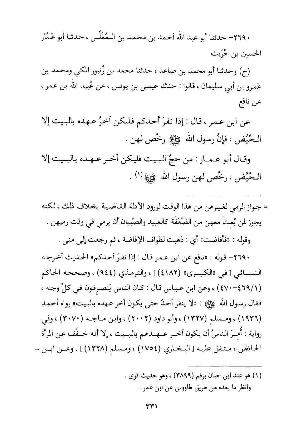 2690 - نا أَبُو عَبْدِ اللَّهِ أَحْمَدُ بْنُ مُحَمَّدٍ الْمُغَلِّسُ , نا أَبُو عَمَّارٍ الْحُسَيْنُ بْنُ حُرَيْثٍ , ح وَثنا أَبُو مُحَمَّدِ بْنُ صَاعِدٍ , نا مُحَمَّدُ بْنُ زُنْبُورٍ الْمَكِّيُّ , وَمُحَمَّدُ بْنُ عَمْرِو بْنِ سُلَيْمَانَ , قَالُوا: نا عِيسَى بْنُ يُونُسَ , عَنْ عُبَيْدِ اللَّهِ بْنِ عُمَرَ , عَنْ نَافِعٍ , عَنِ ابْنِ عُمَرَ , قَالَ: § «إِذَا نَفَرَ أَحَدُكُمْ فَلْيَكُنْ آخِرُ عَهْدِهِ بِالْبَيْتِ , إِلَّا الْحُيَّضُ؛ فَإِنَّ رَسُولَ اللَّهِ صَلَّى اللهُ عَلَيْهِ وَسَلَّمَ رَخَّصَ لَهُنَّ». وَقَالَ أَبُو عَمَّارٍ: «مَنْ حَجَّ الْبَيْتَ فَلْيَكُنْ آخِرُ عَهْدِهِ بِالْبَيْتِ إِلَّا الْحُيَّضُ رَخَّصَ لَهُنَّ رَسُولُ اللَّهِ صَلَّى اللهُ عَلَيْهِ وَسَلَّمَ»