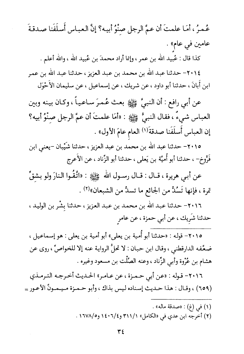 2014 - حَدَّثَنَا عَبْدُ اللَّهِ بْنُ مُحَمَّدِ بْنِ عَبْدِ الْعَزِيزِ , ثنا عَبْدُ اللَّهِ بْنُ عُمَرَ بْنِ أَبَانَ , ثنا أَبُو دَاوُدَ , عَنْ شَرِيكٍ , عَنْ إِسْمَاعِيلَ , عَنْ سُلَيْمَانَ الْأَحْوَلِ , عَنْ أَبِي رَافِعٍ , أَنَّ النَّبِيَّ صَلَّى اللهُ عَلَيْهِ وَسَلَّمَ بَعَثَ عُمَرَ سَاعِيًا فَكَانَ بَيْنَهُ وَبَيْنَ الْعَبَّاسِ شَيْءٌ , فَقَالَ النَّبِيُّ صَلَّى اللهُ عَلَيْهِ وَسَلَّمَ: «أَمَا عَلِمْتَ أَنَّ §عَمَّ الرَّجُلِ صِنْوُ أَبِيهِ؟ إِنَّ الْعَبَّاسَ أَسْلَفْنَا صَدَقَةَ الْعَامِ عَامِ الْأَوَّلِ»