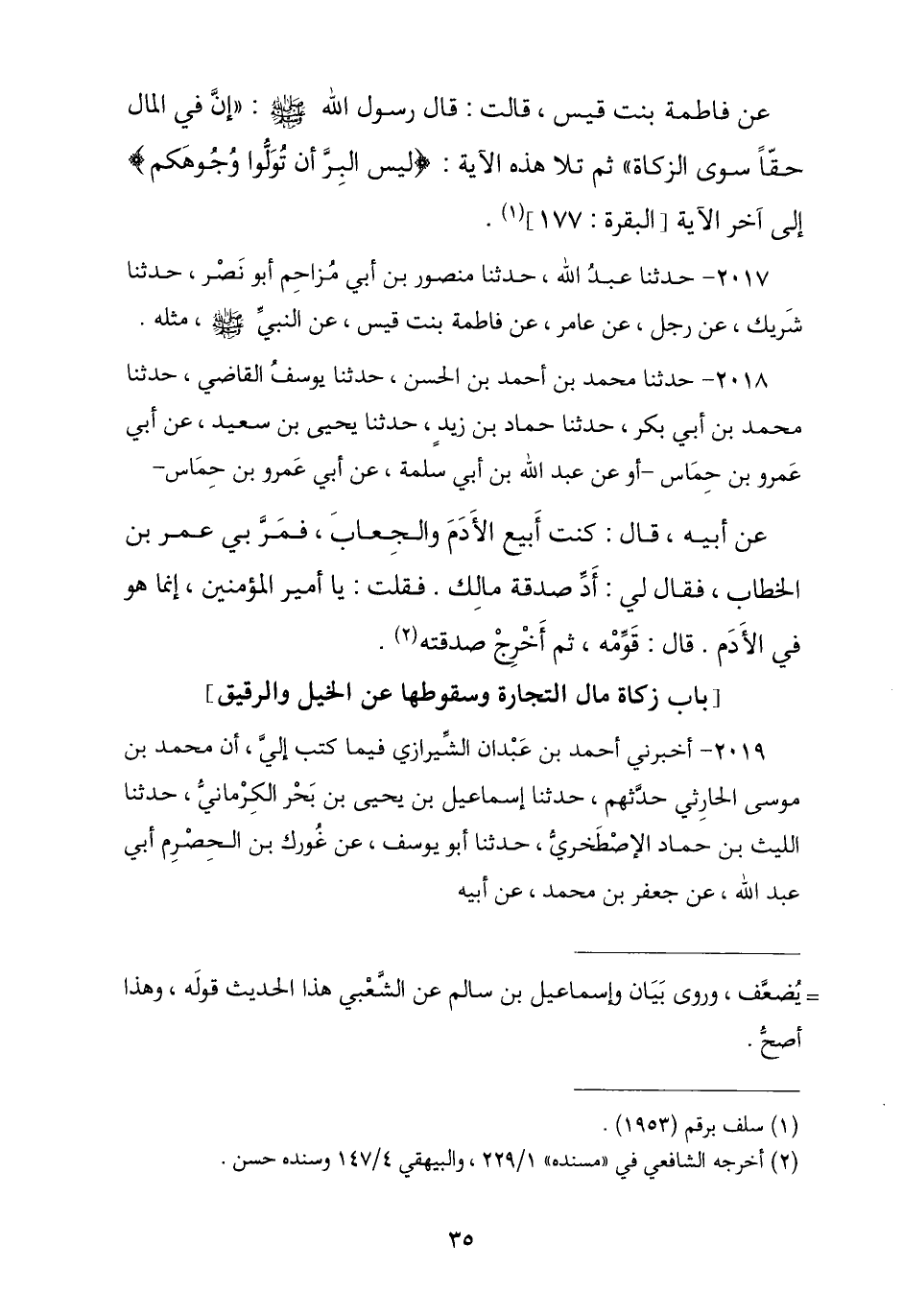 2018 - حَدَّثَنَا مُحَمَّدُ بْنُ أَحْمَدَ , ثنا يُوسُفُ الْقَاضِي , ثنا مُحَمَّدُ بْنُ أَبِي بَكْرٍ , ثنا حَمَّادُ بْنُ زَيْدٍ , ثنا يَحْيَى بْنُ سَعِيدٍ , عَنْ أَبِي عَمْرِو بْنِ حِمَاسٍ , أَوْ عَنْ عَبْدِ اللَّهِ بْنِ أَبِي سَلَمَةَ , عَنْ أَبِي عَمْرِو بْنِ حِمَاسٍ , عَنْ أَبِيهِ , قَالَ: كُنْتُ أَبِيعُ الْأُدُمَ وَالْجِعَابَ فَمَرَّ بِي عُمَرُ بْنُ الْخَطَّابِ فَقَالَ لِي: «§أَدِّ صَدَقَةَ مَالِكَ» , فَقُلْتُ: يَا أَمِيرَ الْمُؤْمِنِينَ إِنَّمَا هُوَ فِي الْأُدُمِ , قَالَ: «قَوِّمْهُ ثُمَّ أَخْرِجْ صَدَقَتَهُ»