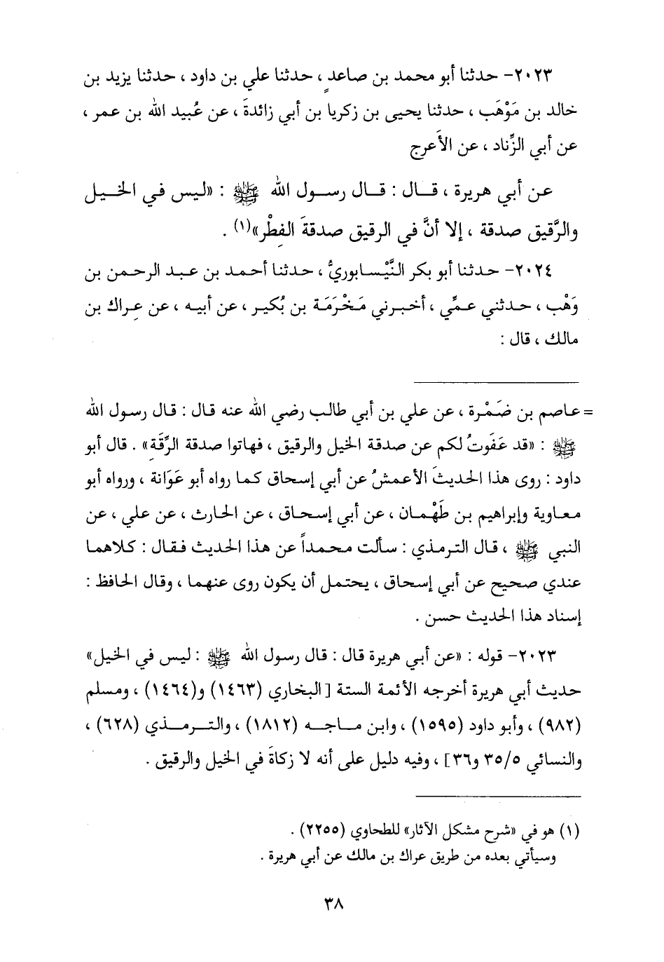 2023 - حَدَّثَنَا أَبُو مُحَمَّدِ بْنُ صَاعِدٍ , ثنا عَلِيُّ بْنُ دَاوُدَ , ثنا يَزِيدُ بْنُ خَالِدِ بْنِ مَوْهَبٍ , ثنا يَحْيَى بْنُ زَكَرِيَّا بْنِ أَبِي زَائِدَةَ , عَنْ عُبَيْدِ اللَّهِ بْنِ عُمَرَ , عَنْ أَبِي الزِّنَادِ , عَنِ الْأَعْرَجِ , عَنْ أَبِي هُرَيْرَةَ , قَالَ: قَالَ رَسُولُ اللَّهِ صَلَّى اللهُ عَلَيْهِ وَسَلَّمَ: § «لَيْسَ فِي الْخَيْلِ وَالرَّقِيقِ صَدَقَةٌ إِلَّا أَنَّ فِي الرَّقِيقِ صَدَقَةَ الْفِطْرِ»