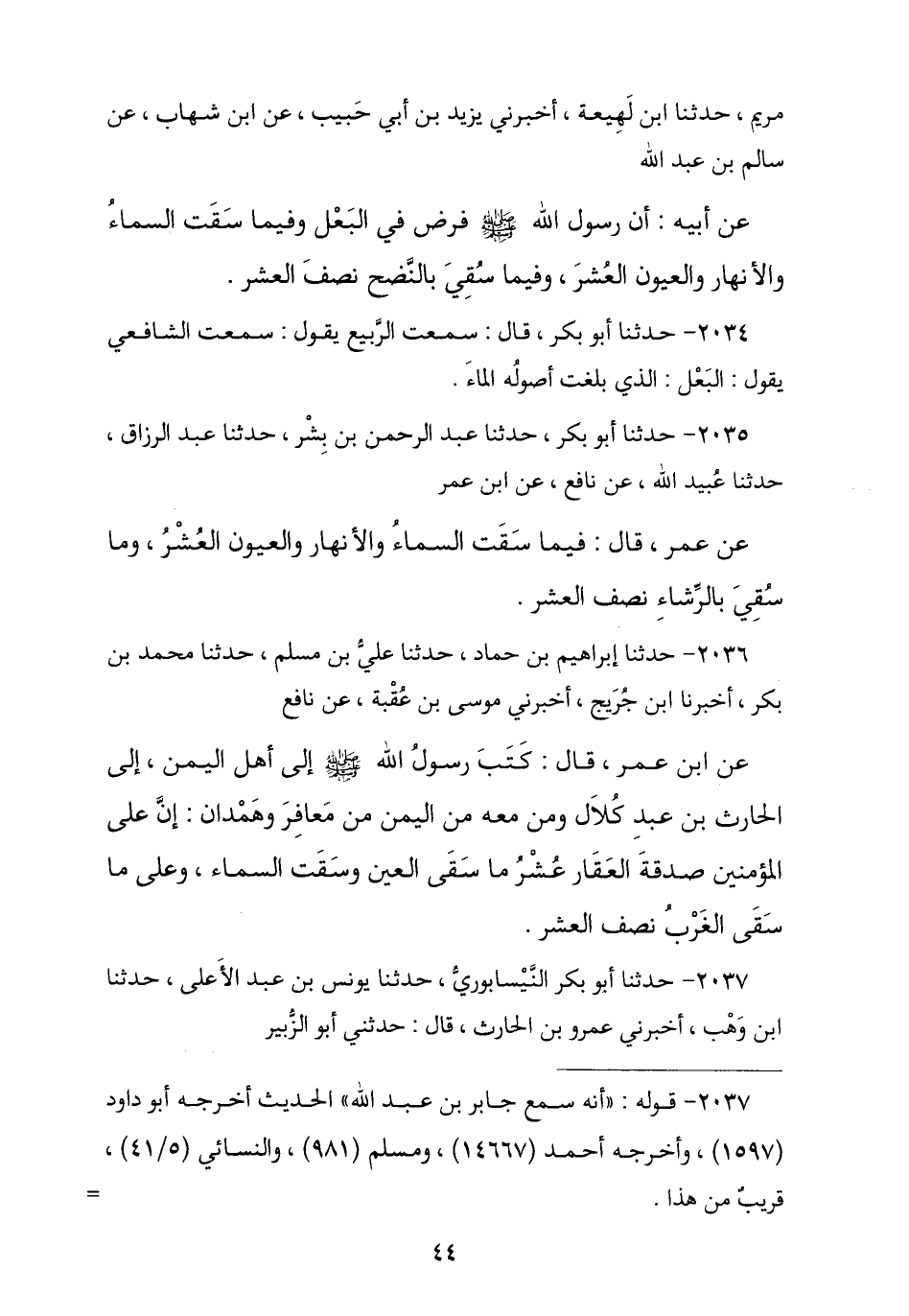 2037 - حَدَّثَنَا أَبُو بَكْرٍ النَّيْسَابُورِيُّ , ثنا يُونُسُ بْنُ عَبْدِ الْأَعْلَى , ثنا ابْنُ وَهْبٍ , أَخْبَرَنِي عَمْرُو بْنُ الْحَارِثِ , حَدَّثَنِي أَبُو الزُّبَيْرِ , -[45]- أَنَّهُ سَمِعَ جَابِرَ بْنَ عَبْدِ اللَّهِ , يَذْكُرُ أَنَّ رَسُولَ اللَّهِ صَلَّى اللهُ عَلَيْهِ وَسَلَّمَ , قَالَ: § «فِيمَا سَقَتِ الْأَنْهَارُ وَالْعُيُونُ الْعُشْرُ وَفِيمَا سُقِيَ بِالسَّانِيَةِ نِصْفُ الْعُشْرِ»