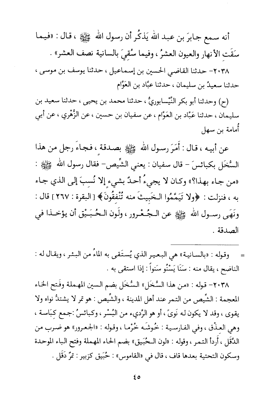 2038 - حَدَّثَنَا الْحُسَيْنُ بْنُ إِسْمَاعِيلَ , ثنا يُوسُفُ بْنُ مُوسَى , ثنا سَعِيدُ بْنُ سُلَيْمَانَ , ثنا عَبَّادُ بْنُ الْعَوَّامِ , ح وَحَدَّثَنَا أَبُو بَكْرٍ النَّيْسَابُورِيُّ , ثنا مُحَمَّدُ بْنُ يَحْيَى , ثنا سَعِيدُ بْنُ سُلَيْمَانَ , ثنا عَبَّادُ بْنُ الْعَوَّامِ , عَنْ سُفْيَانَ بْنِ حُسَيْنٍ , عَنِ الزُّهْرِيِّ , عَنْ أَبِي أُمَامَةَ بْنِ سَهْلٍ , عَنْ أَبِيهِ , قَالَ: أَمَرَ رَسُولُ اللَّهِ صَلَّى اللهُ عَلَيْهِ وَسَلَّمَ بِصَدَقَةٍ فَجَاءَ رَجُلٌ مِنْ هَذَا السَّخْلِ بِكَبَائِسَ , - قَالَ سُفْيَانُ: يَعْنِي الشِّيصَ - فَقَالَ رَسُولُ اللَّهِ صَلَّى اللهُ عَلَيْهِ وَسَلَّمَ: «مَنْ جَاءَ بِهَذَا؟» , وَكَانَ لَا يَجِيءُ أَحَدٌ بِشَيْءٍ إِلَّا نُسِبَ إِلَى الَّذِي جَاءَ بِهِ , فَنَزَلَتْ {§وَلَا تَيَمَّمُوا الْخَبِيثَ مِنْهُ تُنْفِقُونَ} [البقرة: 267] قَالَ: «وَنَهَى رَسُولُ اللَّهِ صَلَّى اللهُ عَلَيْهِ وَسَلَّمَ عَنِ الْجُعْرُورِ وَلَوْنِ الْحُبَيْقِ أَنْ يُؤْخَذَا فِي الصَّدَقَةِ» -[46]- قَالَ الزُّهْرِيُّ: لَوْنَيْنِ مِنْ تَمْرِ الْمَدِينَةِ , وَقَالَ يُوسُفُ: إِلَّا نَسَبُوهُ