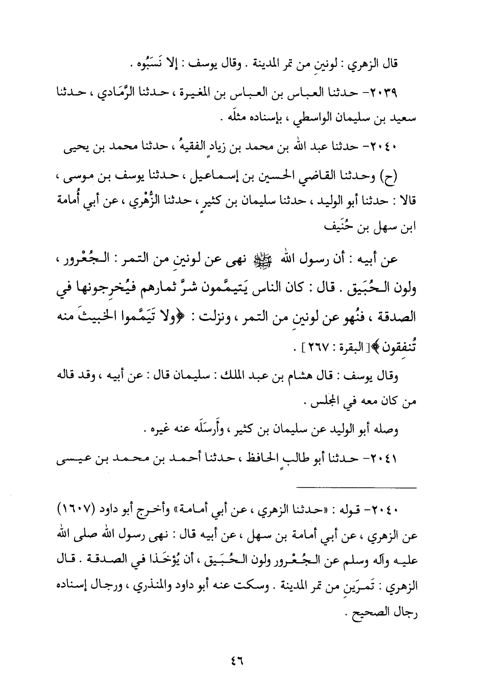 2040 - حَدَّثَنَا عَبْدُ اللَّهِ بْنُ مُحَمَّدِ بْنِ زِيَادٍ الْفَقِيهُ , ثنا مُحَمَّدُ بْنُ يَحْيَى , ح وَحَدَّثَنَا الْحُسَيْنُ بْنُ إِسْمَاعِيلَ , ثنا يُوسُفُ بْنُ مُوسَى , قَالَا: نا أَبُو الْوَلِيدِ , ثنا سُلَيْمَانُ بْنُ كَثِيرٍ , ثنا الزُّهْرِيُّ , عَنْ أَبِي أُمَامَةَ بْنِ سَهْلِ بْنِ حُنَيْفٍ , عَنْ أَبِيهِ , «أَنَّ رَسُولَ اللَّهِ صَلَّى اللهُ عَلَيْهِ وَسَلَّمَ §نَهَى عَنْ لَوْنَيْنِ مِنَ التَّمْرِ , الْجُعْرُورِ وَلَوْنِ الْحُبَيْقِ» , قَالَ: كَانَ النَّاسُ يَتَيَمَّمُونَ شَرَّ ثِمَارِهِمْ فَيُخْرِجُونَهَا فِي الصَّدَقَةِ , فَنَهَى عَنْ لَوْنَيْنِ مِنَ التَّمْرِ وَنَزَلَتْ {وَلَا تَيَمَّمُوا الْخَبِيثَ مِنْهُ تُنْفِقُونَ} [البقرة: 267]. قَالَ يُوسُفُ: قَالَ هِشَامُ بْنُ عَبْدِ الْمَلِكِ: سُلَيْمَانُ قَالَ عَنْ أَبِيهِ وَقَدْ قَالَهُ مَنْ كَانَ مَعَهُ فِي الْمَجْلِسِ وَصَلَهُ أَبُو الْوَلِيدِ , عَنْ سُلَيْمَانَ بْنِ كَثِيرٍ وَأَرْسَلَهُ عَنْهُ غَيْرُهُ.