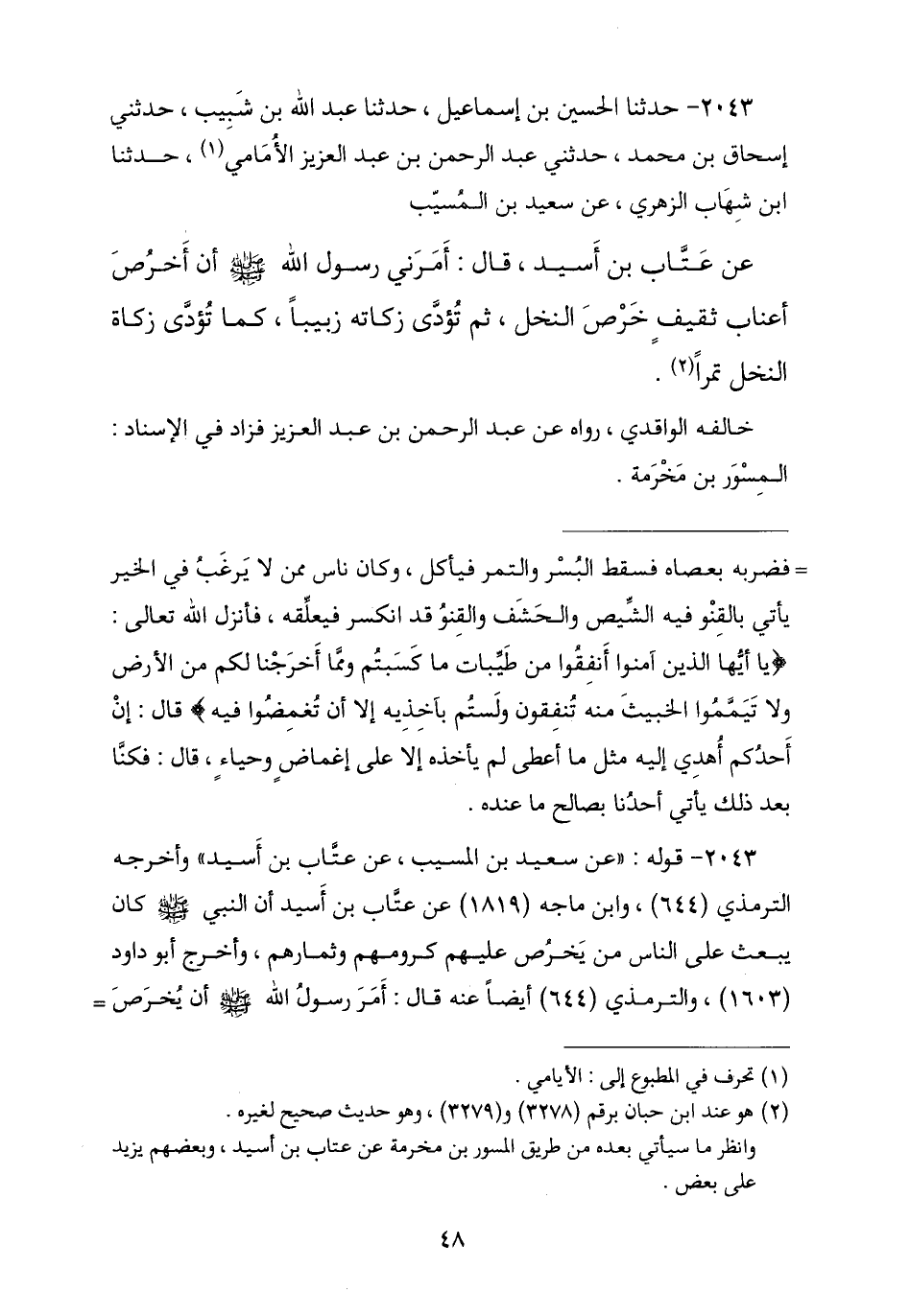 2043 - حَدَّثَنَا الْحُسَيْنُ بْنُ إِسْمَاعِيلَ , ثنا عَبْدُ اللَّهِ بْنُ شَبِيبٍ , حَدَّثَنِي إِسْحَاقُ بْنُ مُحَمَّدٍ , حَدَّثَنِي عَبْدُ الرَّحْمَنِ بْنُ عَبْدِ الْعَزِيزِ الْأَمَامِيُّ , ثنا ابْنُ شِهَابِ الزُّهْرِيُّ , عَنْ سَعِيدِ بْنِ الْمُسَيِّبِ , عَنْ عَتَّابِ بْنِ أَسِيدٍ , قَالَ: أَمَرَنِي رَسُولُ اللَّهِ صَلَّى اللهُ عَلَيْهِ وَسَلَّمَ «أَنْ §أُخَرِّصَ أَعْنَابَ ثَقِيفٍ خَرْصَ النَّخْلِ , ثُمَّ تُؤَدَّى زَكَاتُهُ زَبِيبًا كَمَا تُؤَدَّى زَكَاةُ النَّخْلِ تَمْرًا». وَخَالَفَهُ الْوَاقِدِيُّ رَوَاهُ عَنْ عَبْدِ الرَّحْمَنِ بْنِ عَبْدِ الْعَزِيزِ , فَزَادَ فِي الْإِسْنَادِ: الْمِسْوَرَ بْنَ مَخْرَمَةَ