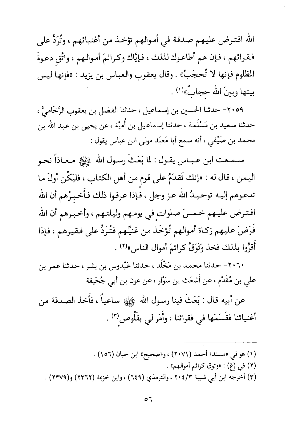2059 - حَدَّثَنَا الْحُسَيْنُ بْنُ إِسْمَاعِيلَ , حَدَّثَنَا الْفَضْلُ بْنُ يَعْقُوبَ الرُّخَامِيُّ , ثنا سَعِيدُ بْنُ مَسْلَمَةَ , ثنا إِسْمَاعِيلُ بْنُ أُمَيَّةَ , عَنْ يَحْيَى بْنِ عَبْدِ اللَّهِ بْنِ صَيْفِيٍّ , أَنَّهُ سَمِعَ أَبَا مَعْبَدٍ مَوْلَى ابْنِ عَبَّاسٍ , يَقُولُ: سَمِعْتُ ابْنَ عَبَّاسٍ , يَقُولُ: لَمَّا بَعَثَ رَسُولُ اللَّهِ صَلَّى اللهُ عَلَيْهِ وَسَلَّمَ مُعَاذًا نَحْوَ الْيَمَنِ , قَالَ لَهُ: «إِنَّكَ §تَقْدُمُ عَلَى قَوْمٍ مِنْ أَهْلِ الْكِتَابِ فَلْيَكُنْ أَوَّلُ مَا تَدْعُوهُمْ إِلَيْهِ تَوْحِيدَ اللَّهِ , فَإِذَا عَرَفُوا ذَلِكَ فَأَخْبِرْهُمْ أَنَّ اللَّهَ افْتَرَضَ عَلَيْهِمْ خَمْسَ صَلَوَاتٍ فِي يَوْمِهِمْ وَلَيْلَتِهِمْ , وَأَخْبِرْهُمْ أَنَّ اللَّهَ فَرَضَ عَلَيْهِمْ زَكَاةَ أَمْوَالِهِمْ تُؤْخَذُ مِنْ غَنِيِّهِمْ فَتُرَدُّ عَلَى فَقِيرِهِمْ , فَإِذَا أَقَرُّوا بِذَلِكَ فَخُذْ وَتَوَقَّ كَرَائِمَ أَمْوَالِ النَّاسِ»