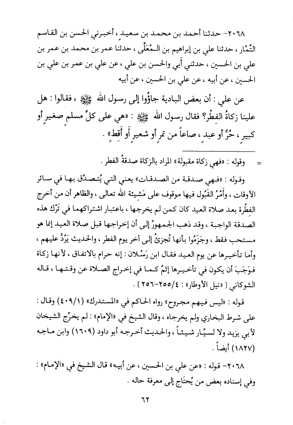 2068 - حَدَّثَنَا أَحْمَدُ بْنُ مُحَمَّدِ بْنِ سَعِيدٍ , أَخْبَرَنِي الْحَسَنُ بْنُ الْقَاسِمِ التَّمَّارُ , ثنا عَلِيُّ بْنُ إِبْرَاهِيمَ بْنِ الْمُعَلَّى , ثنا عُمَرُ بْنُ مُحَمَّدِ بْنِ عُمَرَ بْنِ عَلِيِّ بْنِ الْحُسَيْنِ , حَدَّثَنَا أَبِي , وَالْحَسَنُ بْنُ عَلِيٍّ , عَنْ عَلِيِّ بْنِ عُمَرَ بْنِ عَلِيِّ بْنِ الْحُسَيْنِ , عَنْ أَبِيهِ , عَنْ عَلِيِّ بْنِ الْحُسَيْنِ , عَنْ أَبِيهِ , عَنْ عَلِيٍّ , أَنَّ بَعْضَ الْبَادِيَةِ جَاءُوا إِلَى رَسُولِ اللَّهِ صَلَّى اللهُ عَلَيْهِ وَسَلَّمَ , فَقَالُوا: §هَلْ عَلَيْنَا زَكَاةُ الْفِطْرِ؟ , فَقَالَ رَسُولُ اللَّهِ صَلَّى اللهُ عَلَيْهِ وَسَلَّمَ: «هِيَ عَلَى كُلِّ مُسْلِمٍ صَغِيرٍ أَوْ كَبِيرٍ حُرٍّ أَوْ عَبْدٍ صَاعًا مِنْ تَمْرٍ أَوْ شَعِيرٍ أَوْ أَقِطٍ»
