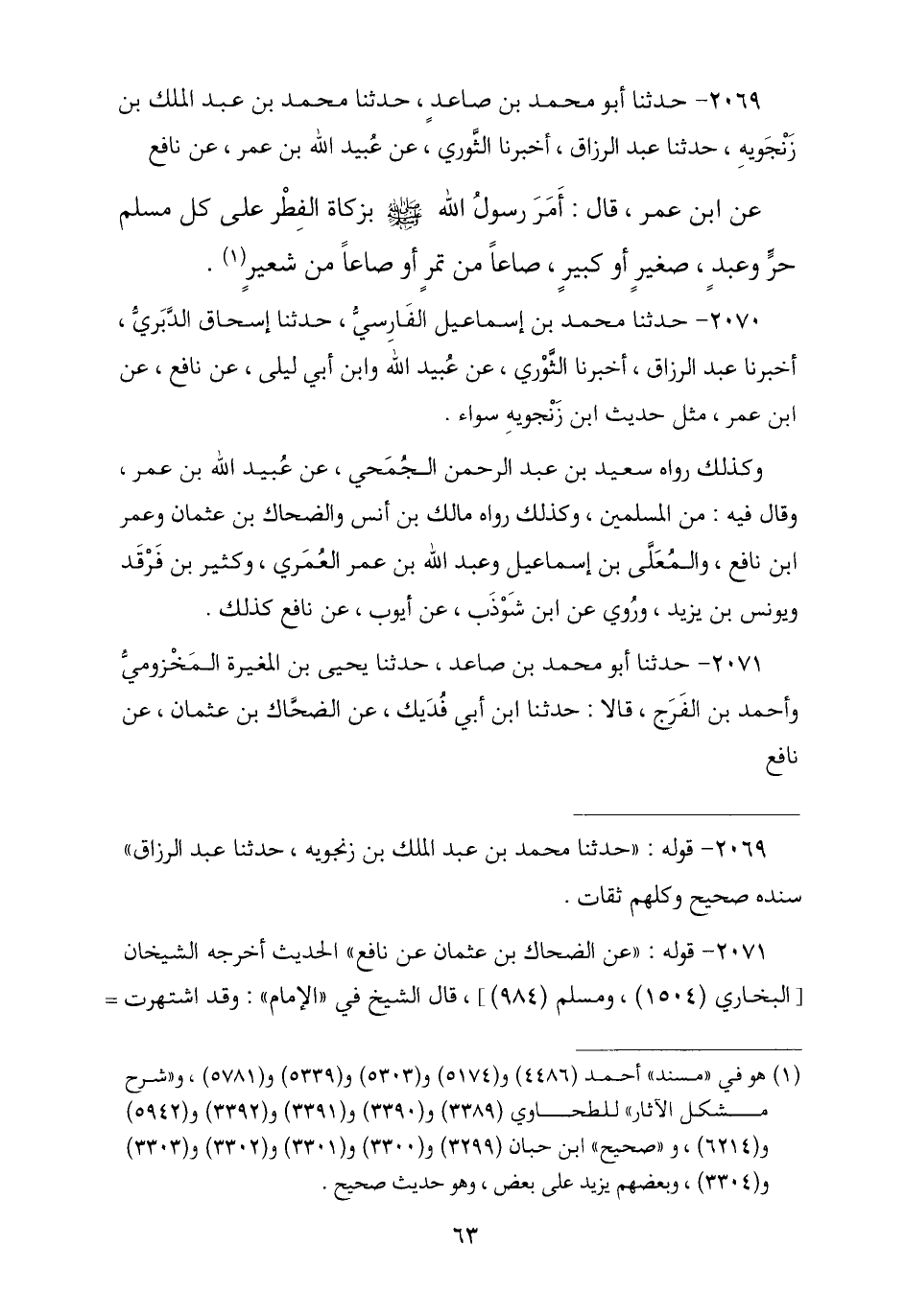 2069 - حَدَّثَنَا أَبُو مُحَمَّدِ بْنُ صَاعِدٍ , ثنا مُحَمَّدُ بْنُ عَبْدِ الْمَلِكِ بْنِ زَنْجُوَيْهِ , ثنا عَبْدُ الرَّزَّاقِ , ثنا الثَّوْرِيُّ , عَنْ عُبَيْدِ اللَّهِ بْنِ عُمَرَ , عَنْ نَافِعٍ , عَنِ ابْنِ عُمَرَ , قَالَ: أَمَرَ رَسُولُ اللَّهِ صَلَّى اللهُ عَلَيْهِ وَسَلَّمَ «بِزَكَاةِ الْفِطْرِ §عَلَى كُلِّ مُسْلِمٍ حُرٍّ وَعَبْدٍ صَغِيرٍ وَكَبِيرٍ صَاعًا مِنْ تَمْرٍ أَوْ صَاعًا مِنْ شَعِيرٍ».