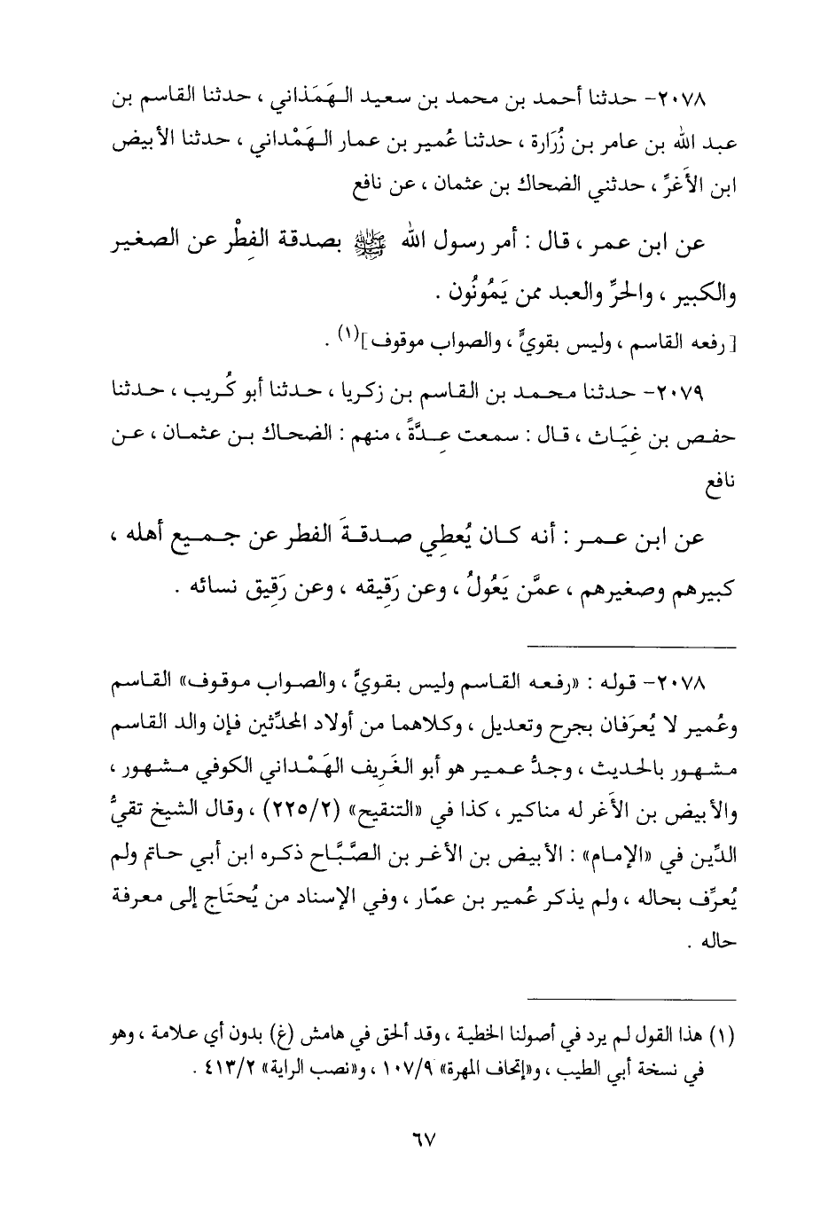 2078 - حَدَّثَنَا أَحْمَدُ بْنُ مُحَمَّدِ بْنِ سَعِيدٍ الْهَمْدَانِيُّ , ثنا الْقَاسِمُ بْنُ عَبْدِ اللَّهِ بْنِ عَامِرِ بْنِ زُرَارَةَ , حَدَّثَنَا عُمَيْرُ بْنُ عَمَّارٍ الْهَمْدَانِيُّ , ثنا الْأَبْيَضُ بْنُ الْأَغَرِّ , حَدَّثَنِي الضَّحَّاكُ بْنُ عُثْمَانَ , عَنْ نَافِعٍ , عَنِ ابْنِ عُمَرَ , قَالَ: «أَمَرَ رَسُولُ اللَّهِ صَلَّى اللهُ عَلَيْهِ وَسَلَّمَ بِصَدَقَةِ الْفِطْرِ §عَنِ الصَّغِيرِ وَالْكَبِيرِ وَالْحُرِّ وَالْعَبْدِ مِمَّنْ تَمُونُونَ». رَفَعَهُ الْقَاسِمُ وَلَيْسَ بِقَوِيٍّ , وَالصَّوَابُ مَوْقُوفٌ