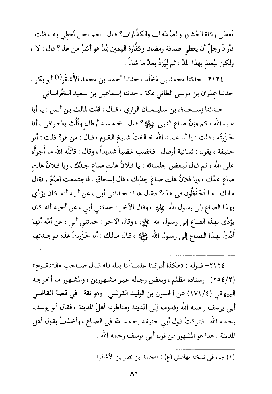 2124 - حَدَّثَنَا مُحَمَّدُ بْنُ مَخْلَدٍ , حَدَّثَنَا أَحْمَدُ بْنُ مُحَمَّدِ بْنِ نَصْرِ بْنِ الْأَشْقَرِ أَبُو بَكْرٍ , ثنا عِمْرَانُ بْنُ مُوسَى الطَّائِيُّ بِمَكَّةَ , ثنا إِسْمَاعِيلُ بْنُ سَعِيدٍ الْخُرَاسَانِيُّ , ثنا إِسْحَاقُ بْنُ سُلَيْمَانَ الرَّازِيُّ , قَالَ: قُلْتُ لِمَالِكِ بْنِ أَنَسٍ: يَا أَبَا عَبْدِ اللَّهِ §كَمْ وَزْنُ صَاعِ النَّبِيِّ صَلَّى اللهُ عَلَيْهِ وَسَلَّمَ؟ , قَالَ: «خَمْسَةُ أَرْطَالٍ وَثُلُثٌ بِالْعِرَاقِيِّ , أَنَا حَزَرْتُهُ» , قُلْتُ: يَا أَبَا عَبْدِ اللَّهِ خَالَفْتَ شَيْخَ الْقَوْمِ , قَالَ: «مَنْ هُوَ؟ ,» , قُلْتُ: أَبُو حَنِيفَةَ يَقُولُ: ثَمَانِيَةُ أَرْطَالٍ , فَغَضِبَ غَضَبًا شَدِيدًا , وَقَالَ: «قَاتَلَهُ اللَّهُ مَا أَجْرَأَهُ عَلَى اللَّهِ» , ثُمَّ قَالَ لِبَعْضِ جُلَسَائِهِ: «يَا فُلَانُ هَاتِ صَاعَ جَدِّكَ , وَيَا فُلَانُ هَاتِ صَاعَ عَمِّكَ , وَيَا فُلَانُ هَاتِ صَاعَ جَدَّتِكَ» , قَالَ إِسْحَاقُ: فَاجْتَمَعَ آصُعٌ , فَقَالَ مَالِكٌ: «مَا تَحْفَظُونَ فِي هَذِهِ؟» , فَقَالَ: هَذَا حَدَّثَنِي أَبِي عَنْ أَبِيهِ أَنَّهُ كَانَ يُؤَدِّي بِهَذَا الصَّاعِ إِلَى رَسُولِ اللَّهِ صَلَّى اللهُ عَلَيْهِ وَسَلَّمَ , وَقَالَ الْآخَرُ: حَدَّثَنِي أَبِي عَنْ أَخِيهِ أَنَّهُ كَانَ يُؤَدِّي بِهَذَا الصَّاعِ إِلَى رَسُولِ اللَّهِ صَلَّى اللهُ عَلَيْهِ وَسَلَّمَ , وَقَالَ الْآخَرُ: حَدَّثَنِي أَبِي عَنْ أُمِّهِ أَنَّهَا أَدَّتْ بِهَذَا الصَّاعِ إِلَى رَسُولِ اللَّهِ صَلَّى اللهُ عَلَيْهِ وَسَلَّمَ , قَالَ مَالِكٌ: «أَنَا حَزَرْتُ هَذِهِ فَوَجَدْتُهَا