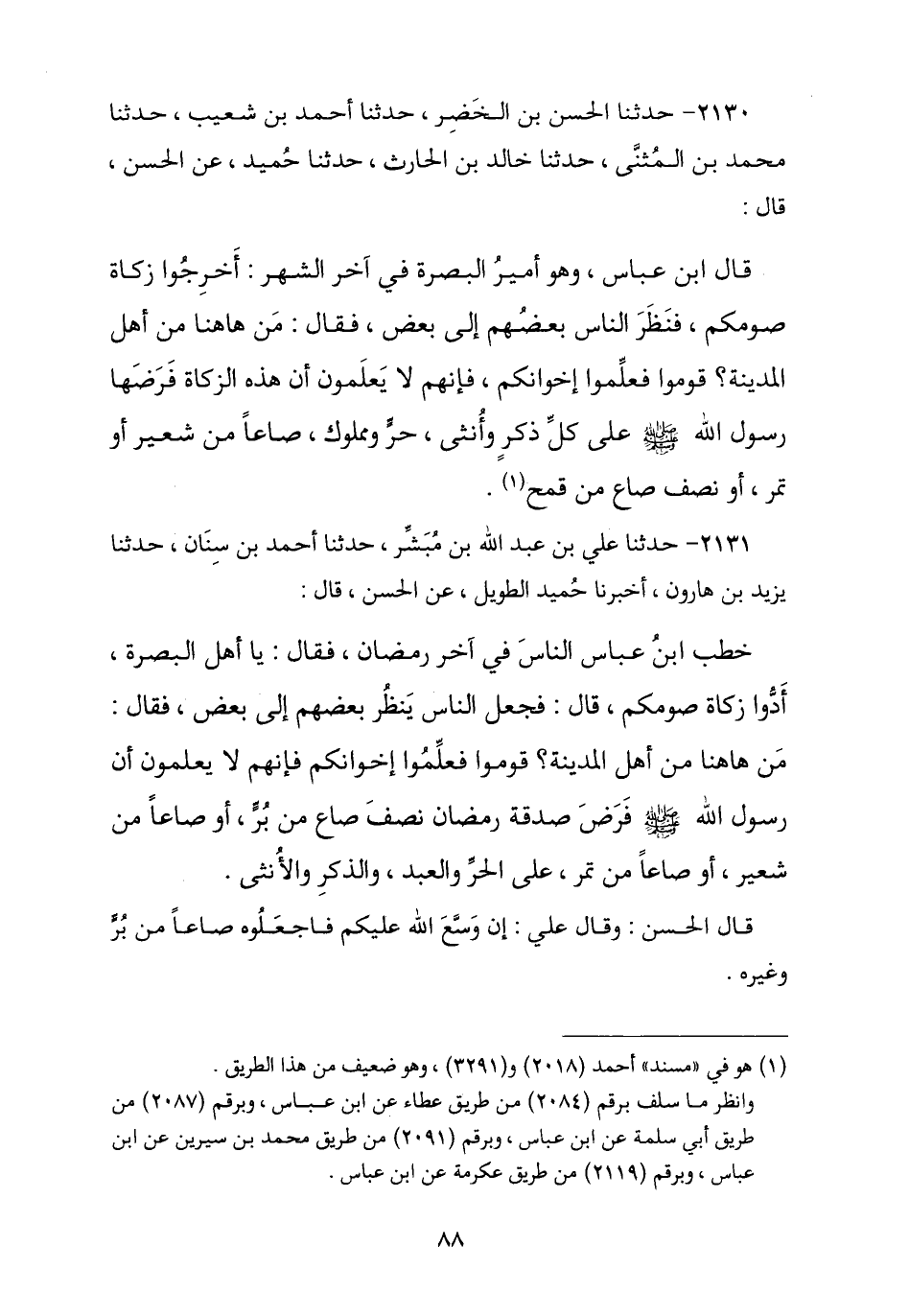 2130 - حَدَّثَنَا الْحَسَنُ بْنُ الْخَضِرِ , ثنا أَحْمَدُ بْنُ شُعَيْبٍ , ثنا مُحَمَّدُ بْنُ الْمُثَنَّى , ثنا خَالِدُ بْنُ الْحَارِثِ , ثنا حُمَيْدٌ , عَنْ الْحَسَنِ , قَالَ: قَالَ ابْنُ عَبَّاسٍ وَهُوَ أَمِيرُ الْبَصْرَةِ فِي آخِرِ الشَّهْرِ: «§أَخْرِجُوا زَكَاةَ صَوْمِكُمْ» , فَنَظَرَ النَّاسُ بَعْضُهُمْ إِلَى بَعْضٍ , فَقَالَ: «مَنْ هَاهُنَا مِنْ أَهْلِ الْمَدِينَةِ؟ قُومُوا فَعَلِّمُوا إِخْوَانَكُمْ , فَإِنَّهُمْ لَا يَعْلَمُونَ أَنَّ هَذِهِ الزَّكَاةَ فَرَضَهَا رَسُولُ اللَّهِ صَلَّى اللهُ عَلَيْهِ وَسَلَّمَ عَلَى كُلِّ ذَكَرٍ وَأُنْثَى حُرٍّ وَمَمْلُوكٍ صَاعًا مِنْ شَعِيرٍ أَوْ تَمْرٍ , أَوْ نِصْفَ صَاعٍ مِنْ قَمْحٍ»