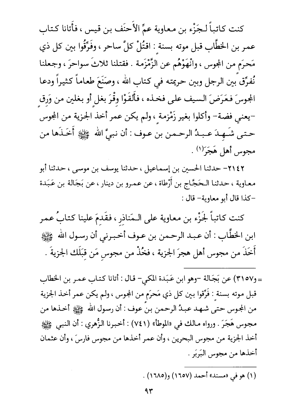 2142 - حَدَّثَنَا الْحُسَيْنُ بْنُ إِسْمَاعِيلَ , ثنا يُوسُفُ بْنُ مُوسَى , ثنا أَبُو مُعَاوِيَةَ , ثنا الْحَجَّاجُ بْنُ أَرْطَاةَ , عَنْ عَمْرِو بْنِ دِينَارٍ , عَنْ بَجَالَةَ بْنِ عَبْدَةَ - كَذَا قَالَ أَبُو مُعَاوِيَةَ - قَالَ: كُنْتُ كَاتِبًا لِجَزْءِ بْنِ مُعَاوِيَةَ عَلَى الْمَنَاذِرِ , فَقَدِمَ عَلَيْنَا كِتَابُ عُمَرَ بْنِ الْخَطَّابِ , أَنَّ عَبْدَ الرَّحْمَنِ بْنَ عَوْفٍ أَخْبَرَنِي , أَنَّ رَسُولَ اللَّهِ صَلَّى اللهُ عَلَيْهِ وَسَلَّمَ § «أَخَذَ مِنَ الْمَجُوسِ أَهْلِ هَجَرَ الْجِزْيَةَ». فَخُذْ مِنْ مَجُوسِ مَنْ قِبَلَكَ الْجِزْيَةَ. حَجَّاجٌ لَا يُحْتَجُّ بِهِ