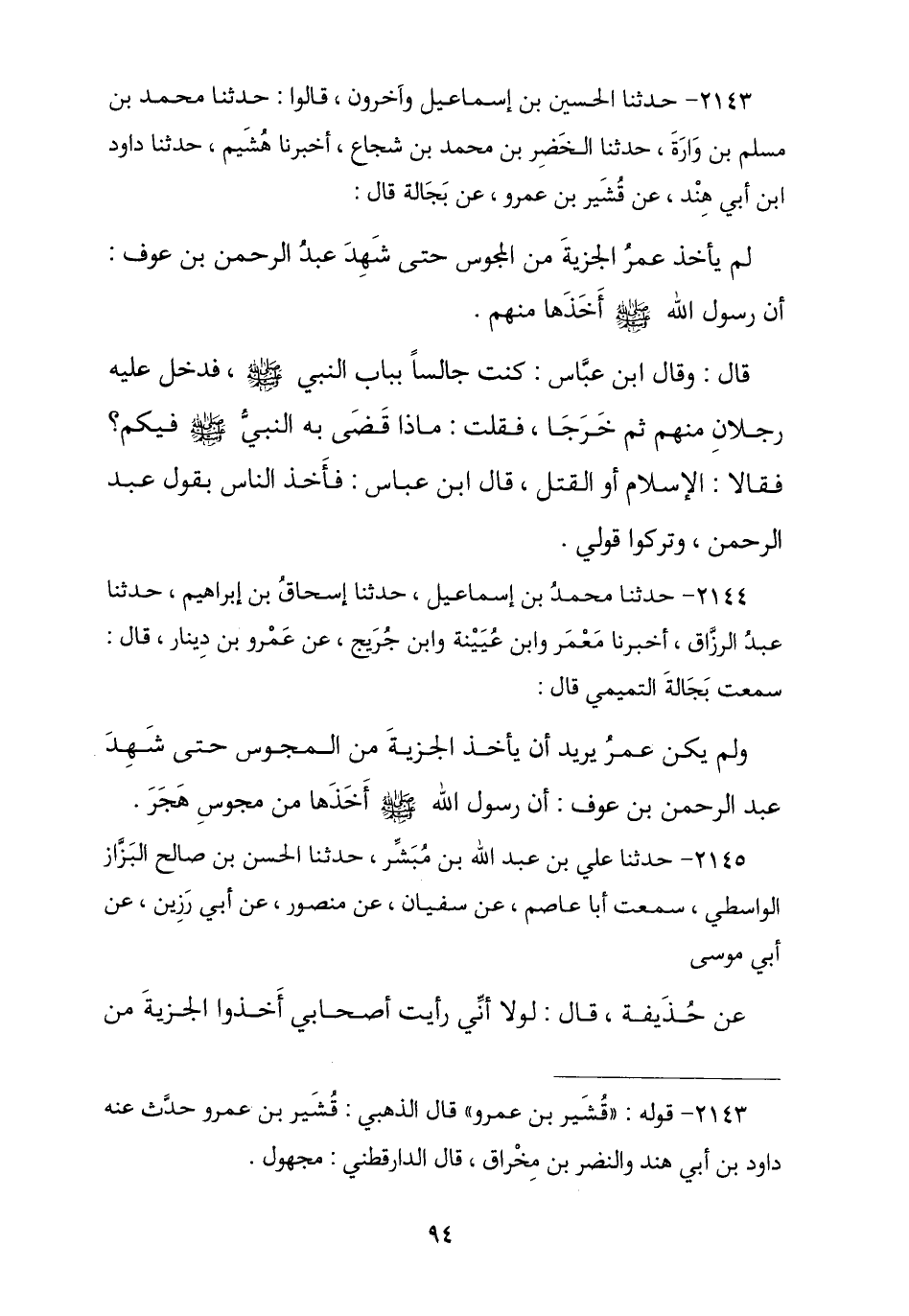 2143 - حَدَّثَنَا الْحُسَيْنُ بْنُ إِسْمَاعِيلَ وَآخَرُونَ , قَالُوا: نا مُحَمَّدُ بْنُ مُسْلِمِ بْنِ وَارَهٍ , نا الْخَضِرُ بْنُ مُحَمَّدِ بْنِ شُجَاعٍ , أنا هُشَيْمٌ , نا دَاوُدُ بْنُ أَبِي هِنْدَ , عَنْ قُشَيْرِ بْنِ عَمْرٍو , عَنْ بَجَالَةَ , قَالَ: لَمْ يَأْخُذْ عُمَرُ §الْجِزْيَةَ مِنَ الْمَجُوسِ حَتَّى شَهِدَ عَبْدُ الرَّحْمَنِ بْنُ عَوْفٍ , «أَنَّ رَسُولَ اللَّهِ صَلَّى اللهُ عَلَيْهِ وَسَلَّمَ أَخَذَ مِنْهُمْ». قَالَ: وَقَالَ ابْنُ عَبَّاسٍ: كُنْتُ جَالِسًا بِبَابِ النَّبِيِّ صَلَّى اللهُ عَلَيْهِ وَسَلَّمَ فَدَخَلَ عَلَيْهِ رَجُلَانِ مِنْهُمْ ثُمَّ خَرَجَا , فَقُلْتُ: مَاذَا قَضَى رَسُولُ اللَّهِ صَلَّى اللهُ عَلَيْهِ وَسَلَّمَ؟ , فَقَالَا: الْإِسْلَامُ أَوِ الْقَتْلُ , قَالَ ابْنُ عَبَّاسٍ: فَأَخَذَ النَّاسُ بِقَوْلِ عَبْدِ الرَّحْمَنِ وَتَرَكُوا قُولِي