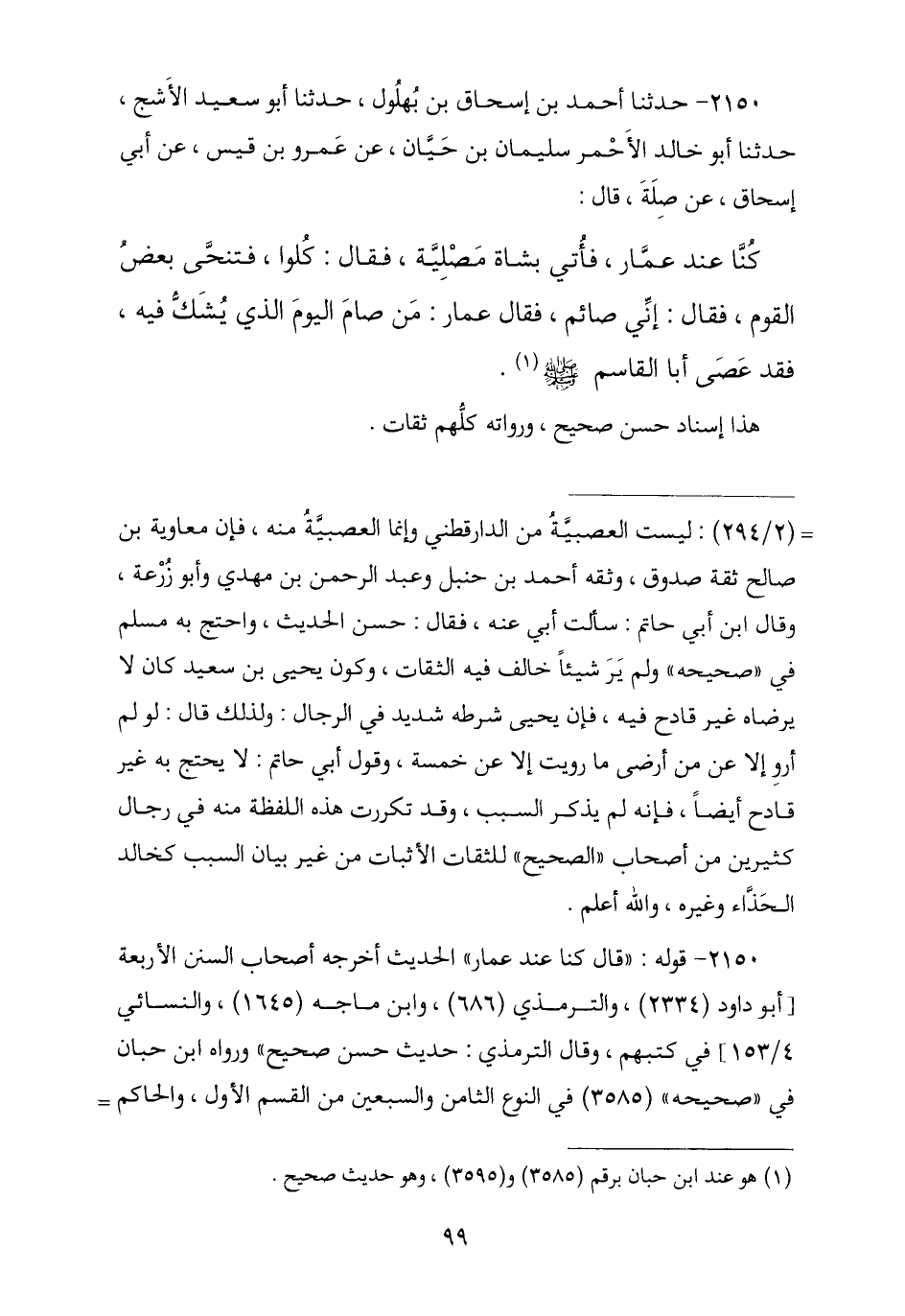 2150 - أَخْبَرَنَا أَحْمَدُ بْنُ إِسْحَاقَ بْنِ بُهْلُولٍ , ثنا أَبُو سَعِيدٍ الْأَشَجُّ , ثنا أَبُو خَالِدٍ الْأَحْمَرُ سُلَيْمَانُ بْنُ حَيَّانَ , عَنْ عَمْرِو بْنِ قَيْسٍ , عَنْ أَبِي إِسْحَاقَ , عَنْ صِلَةَ , قَالَ: كُنَّا عِنْدَ عَمَّارٍ فَأُتِيَ بِشَاةٍ مَصْلِيَّةٍ , فَقَالَ: «كُلُوا» , فَتَنَحَّى بَعْضُ الْقَوْمِ , فَقَالَ: «إِنِّي صَائِمٌ» , فَقَالَ عَمَّارٌ: § «مَنْ صَامَ الْيَوْمَ الَّذِي شَكَّ فِيهِ فَقَدْ عَصَى أَبَا الْقَاسِمِ صَلَّى اللهُ عَلَيْهِ وَسَلَّمَ». هَذَا إِسْنَادٌ حَسَنٌ صَحِيحٌ وَرُوَاتُهُ كُلُّهُمْ ثِقَاتٌ