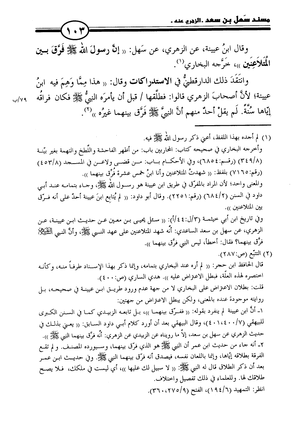 ١ - أنَّ ابن عيينة لم ينفرد بقوله: "ففرّق بينهما"، بل تابعه الزبيدي كما في السنن الكبرى للبيهقي (٧/ ٤٠٠، ٤٠١)، وقال البيهقي بعد أن أورد كلام أبي داود السابق: "يعني بذلك في حديث الزهري عن سهل بن سعد، إلاَّ ما رويناه عن الزبيدي عن الزهري: أنَّه فرَّق بينهما النبي - صلى الله عليه وسلم -".