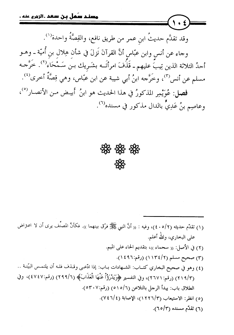 فصل: عُوَيْمِر المذكورُ لا هذا الحديث هو ابنُ أَبيض من الأنصار (٥)،