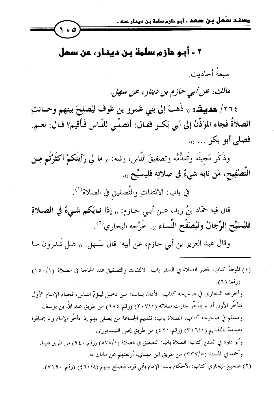 قال فيه حمّاد بنُ زيد، عن أبي حازم: "إذا نابَكم شيءٌ في الصلاةِ فليُسَبِّح الرِّجالُ وليُصَفِّح النِّساء". خَرَّجه البخاري (٢).